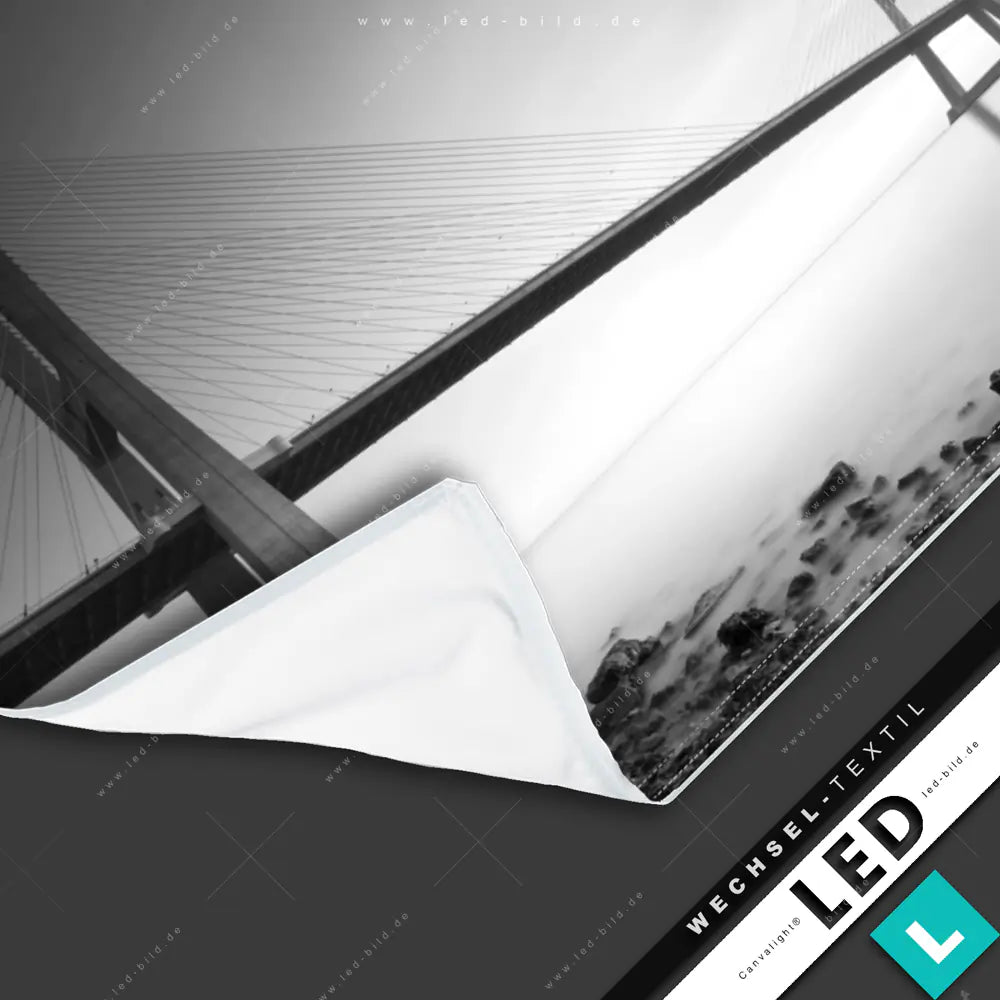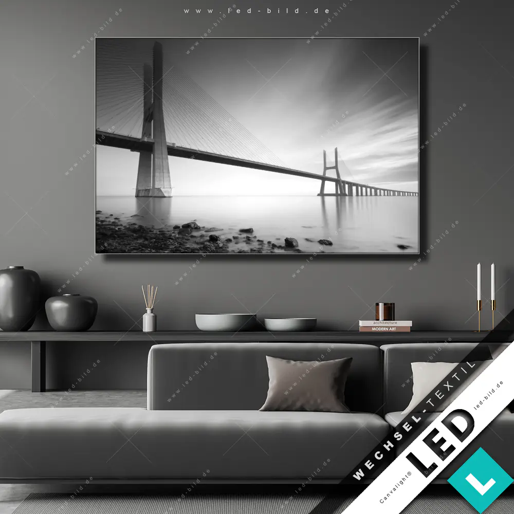 Lass deine Wände sprechen! Mit dem aufregenden Wechselmotiv Brücke am weiten Meer im Querformat verleihst du deinem Spannbild oder LED Bild einen einzigartigen Look. Der farbenfrohe Austausch-Textildruck in Weiss, Schwarz, Grau ist ein echter Blickfang für jeden Raum.