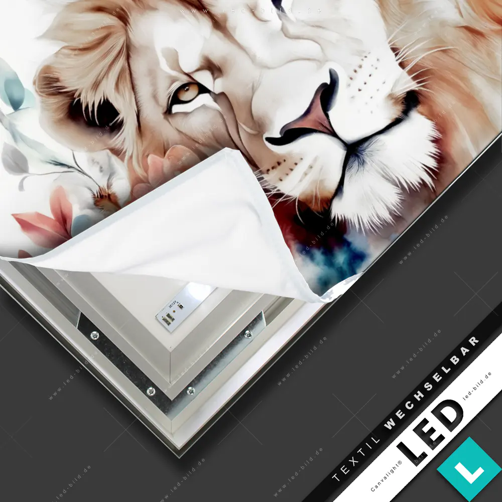 Das Canvalight® TEX LED-Bild | Querformat mit dem Titel Löwe mit Blumen ist ein komplett steckerfertiges Leuchtbild – anschließen, einschalten, genießen. Das 3 Meter lange, weiße Anschlusskabel mit Schalter und Stecker macht die Montage besonders einfach. Alternativ kann das Netzteil auch direkt an ein Wandkabel angeschlossen werden – ganz nach deinen Wohngegebenheiten.