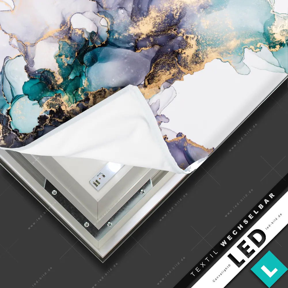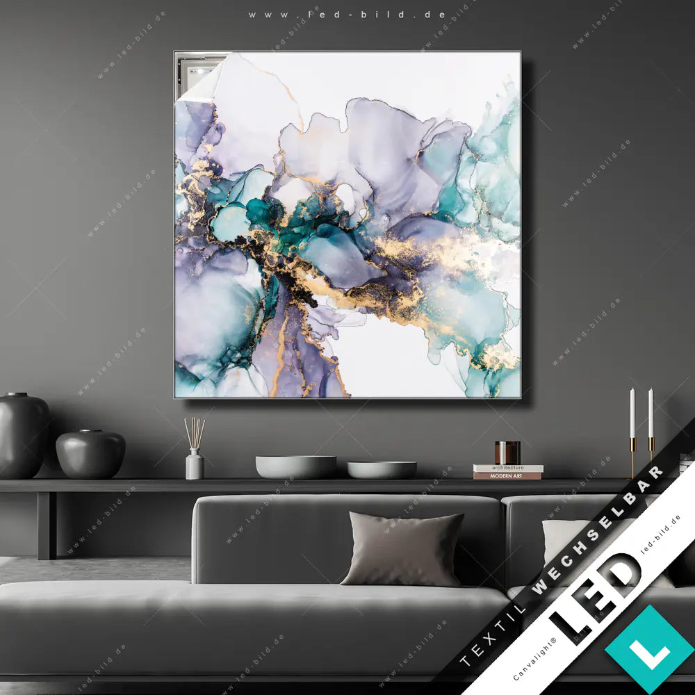 Canvalight® TEX LED Bilder mit Motiven im Abstrakt, Modern Art Stil überzeugen nicht nur technisch, sondern auch optisch. Der elegante Aluminium-Spannrahmen ist in Schwarz, Weiß oder Silber erhältlich und fügt sich harmonisch in jeden Einrichtungsstil ein. Mit einer Bautiefe von nur 50 mm wirkt das Bild schlank und modern, ohne an Stabilität zu verlieren.