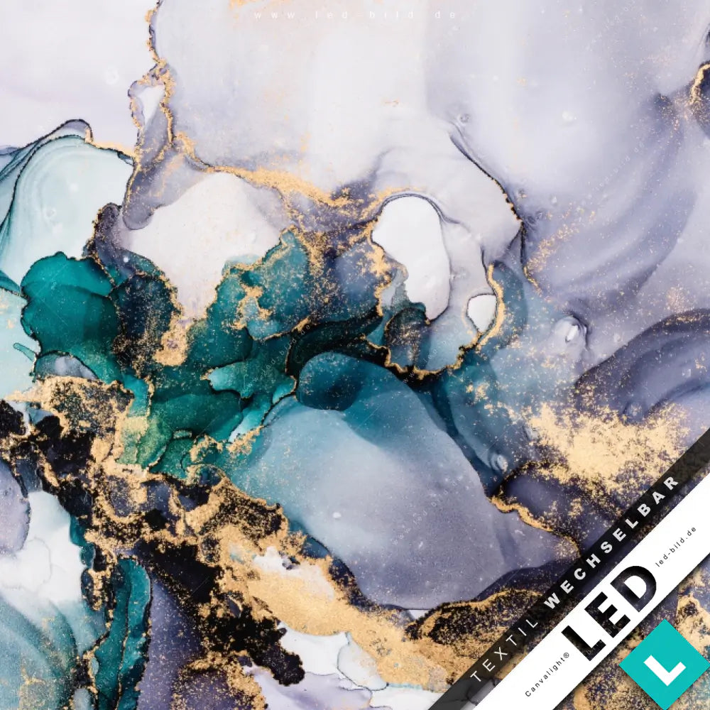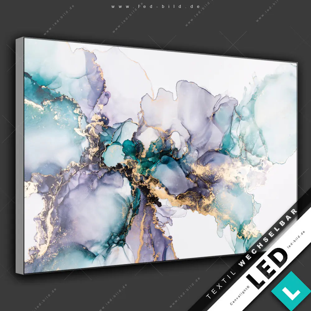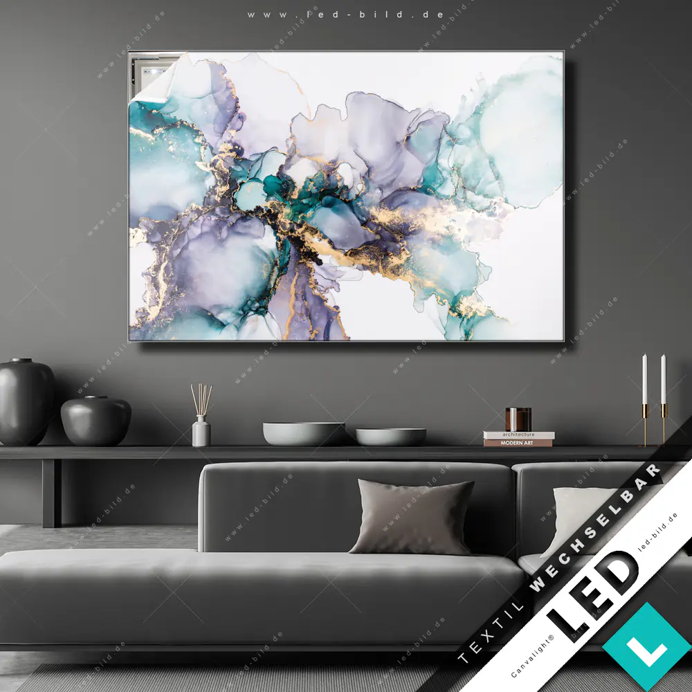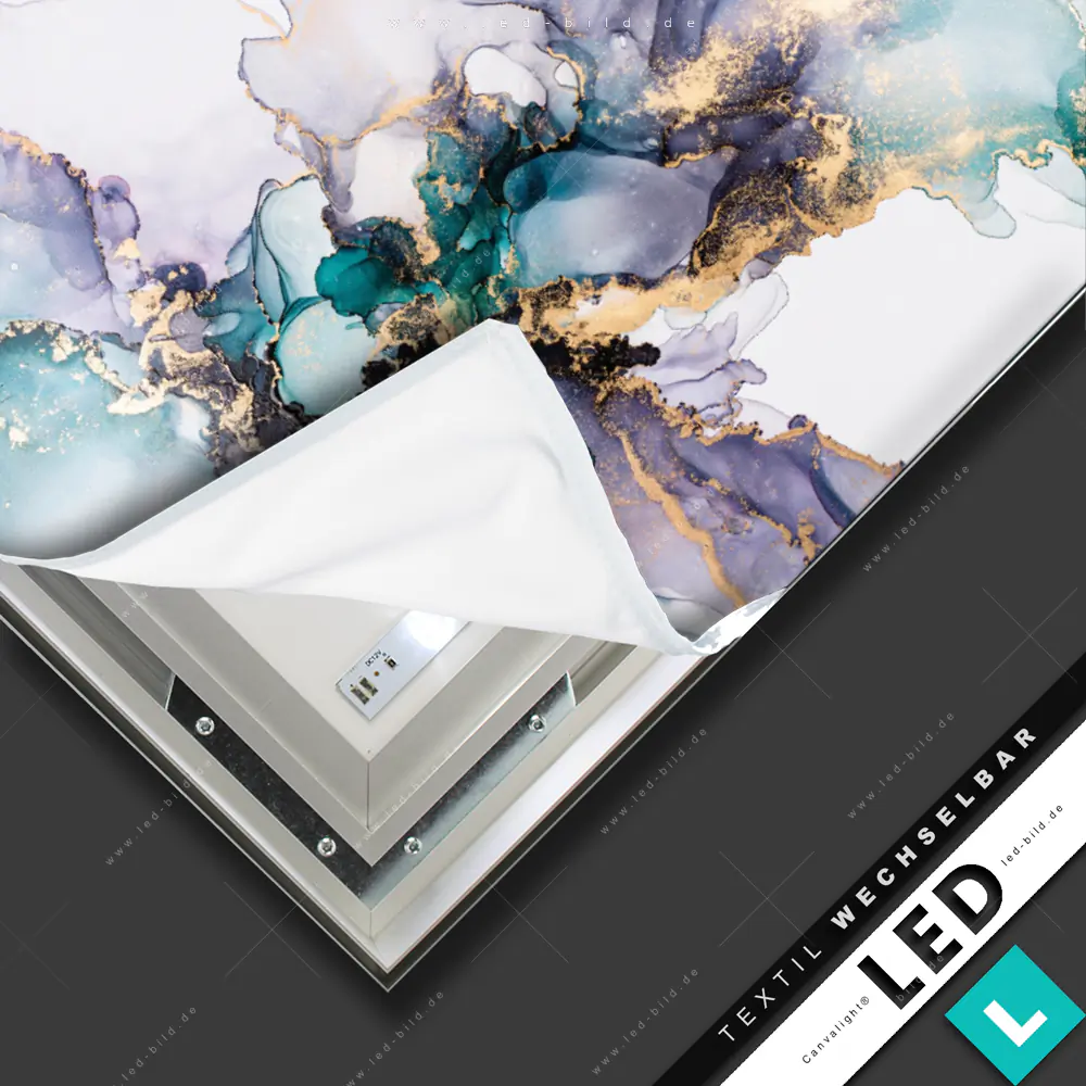 Canvalight® TEX LED Bilder mit Motiven im Abstrakt, Modern Art Stil überzeugen nicht nur technisch, sondern auch optisch. Der elegante Aluminium-Spannrahmen ist in Schwarz, Weiß oder Silber erhältlich und fügt sich harmonisch in jeden Einrichtungsstil ein. Mit einer Bautiefe von nur 50 mm wirkt das Bild schlank und modern, ohne an Stabilität zu verlieren.