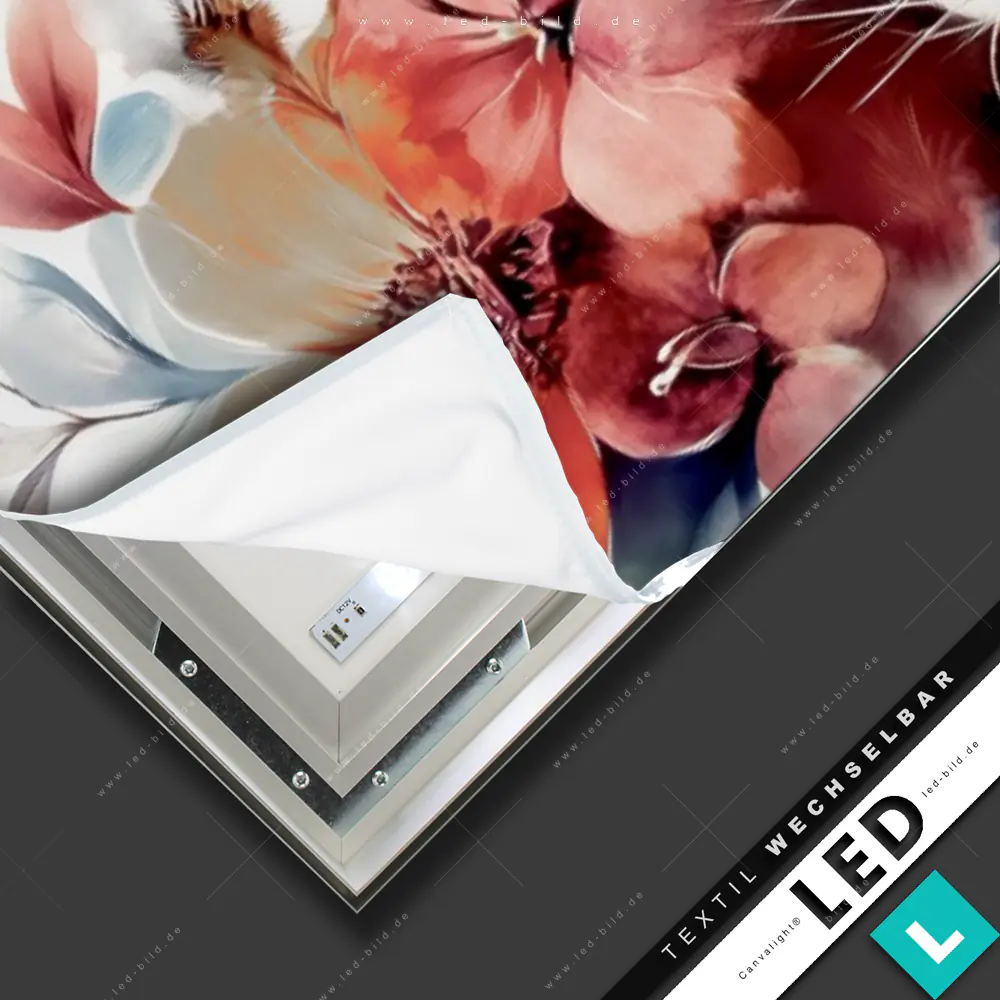 Canvalight® TEX LED Bilder mit Motiven im Abstrakt, Floral, Retro - Vintage Stil überzeugen nicht nur technisch, sondern auch optisch. Der elegante Aluminium-Spannrahmen ist in Schwarz, Weiß oder Silber erhältlich und fügt sich harmonisch in jeden Einrichtungsstil ein. Mit einer Bautiefe von nur 50 mm wirkt das Bild schlank und modern, ohne an Stabilität zu verlieren.