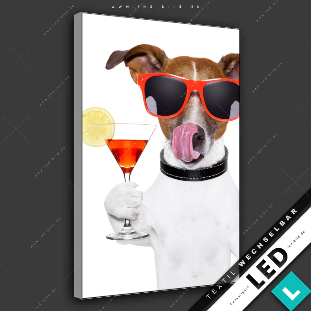 Canvalight® LED-Bild | Lustiger Hund mit Drink | Hochformat