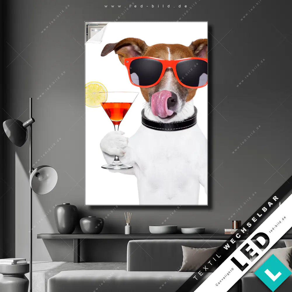 Party-Hund mit Cocktail | Modern, individuell, brillant – dein LED Bild nach Maß