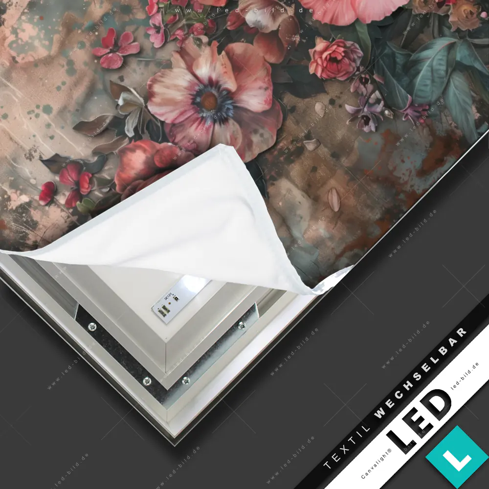 Canvalight® TEX LED Bilder mit Motiven im Floral, Retro - Vintage, Grunge Stil überzeugen nicht nur technisch, sondern auch optisch. Der elegante Aluminium-Spannrahmen ist in Schwarz, Weiß oder Silber erhältlich und fügt sich harmonisch in jeden Einrichtungsstil ein. Mit einer Bautiefe von nur 50 mm wirkt das Bild schlank und modern, ohne an Stabilität zu verlieren.