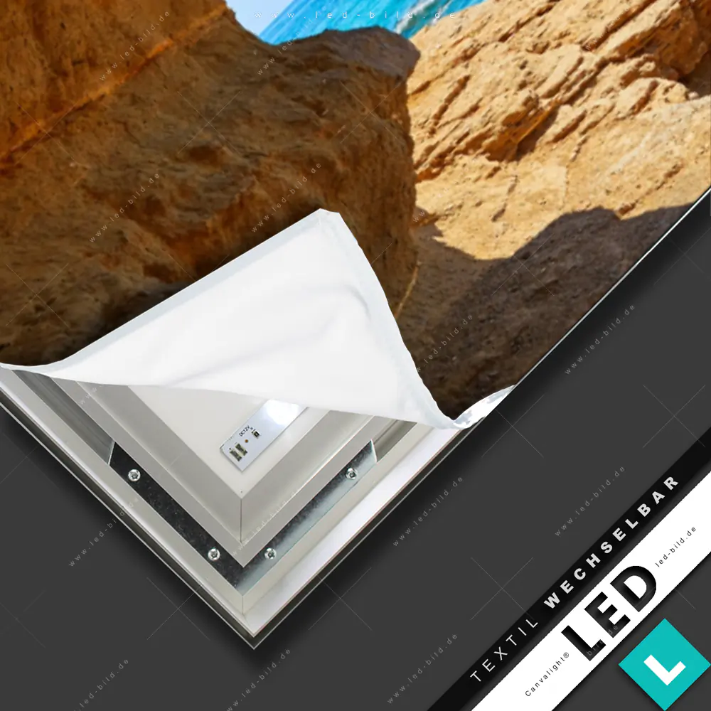 Ein besonderes Highlight ist die Möglichkeit, das Landschaften, Strand - Meer Wechselbild jederzeit durch andere Motive auszutauschen. Der hochwertige Textildruck mit umlaufendem Flachkeder lässt sich einfach in die Nut des Rahmens einführen – werkzeuglos, schnell und ganz ohne Fachkenntnisse. So kannst du je nach Jahreszeit, Stimmung oder Anlass immer wieder neue Akzente setzen.