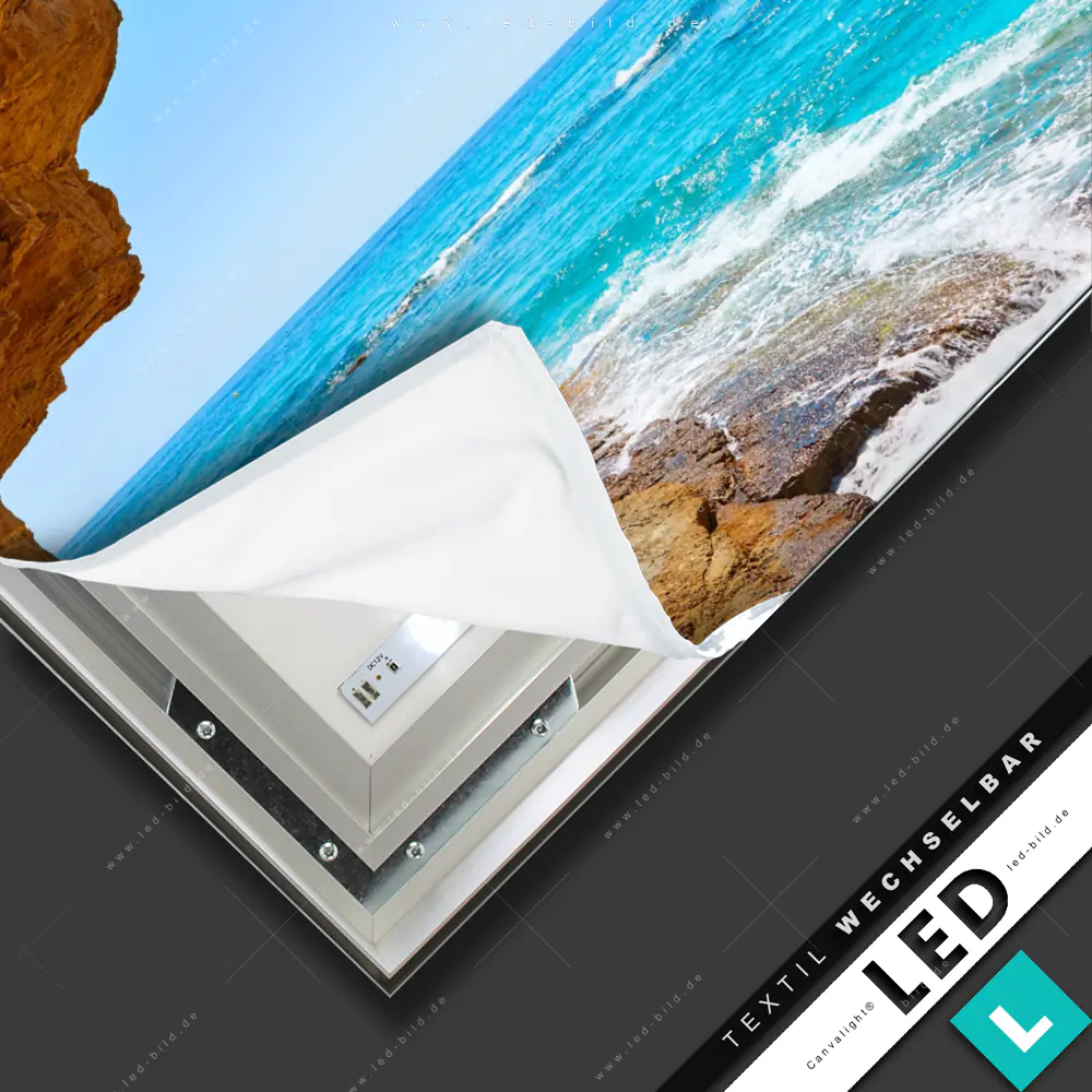 Ein besonderes Highlight ist die Möglichkeit, das Landschaften, Strand - Meer Wechselbild jederzeit durch andere Motive auszutauschen. Der hochwertige Textildruck mit umlaufendem Flachkeder lässt sich einfach in die Nut des Rahmens einführen – werkzeuglos, schnell und ganz ohne Fachkenntnisse. So kannst du je nach Jahreszeit, Stimmung oder Anlass immer wieder neue Akzente setzen.