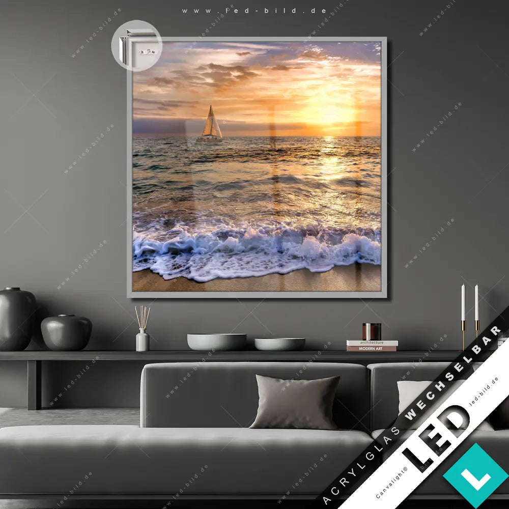 Mit dem wechselbaren Motivsystem dank der cleveren DIA-Funktion wird das LED Acrylglasbild Segeln auf offener See aus der Kategorie Landschaften, Strand - Meer nie langweilig – du kannst die Acrylglasdrucke jederzeit tauschen und deinem Raum im Handumdrehen einen frischen Look verleihen. Ob du nach einem strahlenden Hingucker mit Ostsee, Nordsee, Sonnenaufgang, Urlaub, Abenddämmerung, Sonnenuntergang, Boot, Segelboot, segeln, Meer, Wellen suchst oder deine Einrichtung mit einem beleuchteten Glasbild im Natürlich - Realistisch, Modern Art Stil aufwerten willst – dieses LED Wandbild mit Wechselrahmen-System liefert dir genau das in den leuchtenden Motivfarben Orange, Beige, Blau!