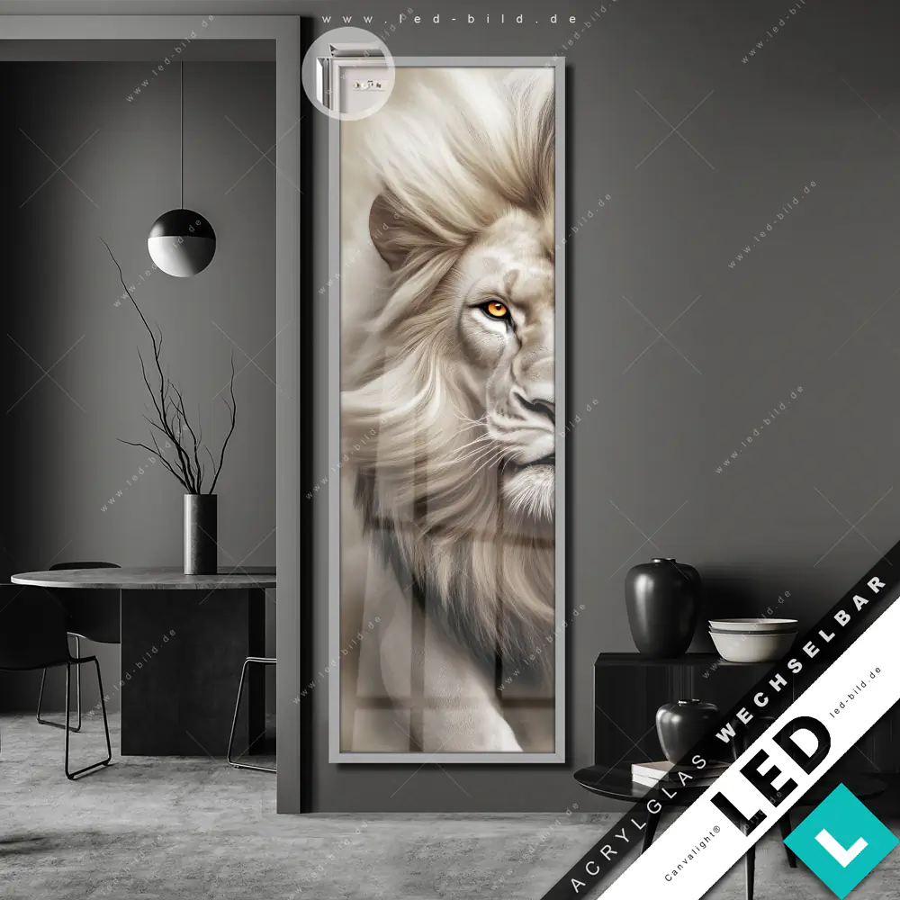 Deine Wände schreien nach mehr Ausdruckskraft und Atmosphäre? Dann ist unser modernes Acrylglas-Leuchtbild König der Tiere im platzsparenden Schmalen Format genau das richtige LED Bild für dich!