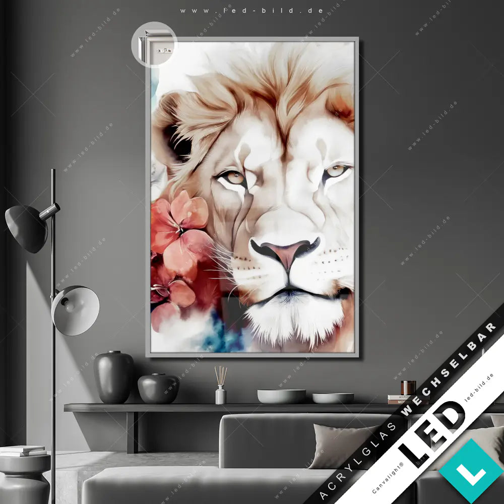 Das dimmbare LED Acrylglasbild Florales Löwenbild aus der Kategorie Tierwelt, Blumen - Botanik ist mehr als nur ein beleuchtetes Bild – es ist ein Erlebnis! Ob in Wohnzimmer - Schlafzimmer, Flur - Eingangsbereich, Arzt - Praxis oder deinem individuellen Rückzugsort – mit der mitgelieferten Fernbedienung steuerst du Lichtintensität und (optional) sogar die Farbtemperatur ganz nach deinem Gefühl. Deine Gäste werden dank diesem Wechselrahmen-System aus dem Staunen nicht mehr herauskommen!