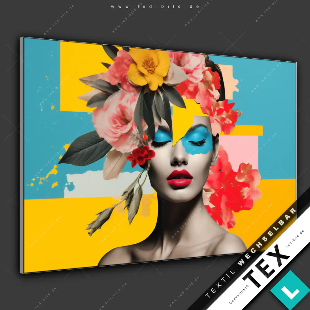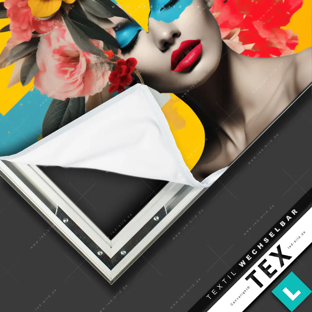 Also worauf wartest du noch? Lass die Magie los und verwandle deine vier Wände in ein kunterbuntes Kunstspektakel! Bestelle jetzt unser Canvalight® TEX Wechselbild Blüten im Haar einer Frau und zeig der Langeweile, wer hier das Zepter schwingt!