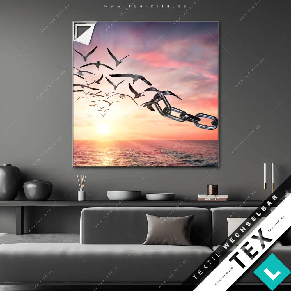 Mit unserem Wechselbild Fliegen über dem Wasser aus der Kategorie Landschaften, Strand - Meer, Tierwelt wird deine Einrichtung auf ein ganz neues Level gehoben und Langeweile hat keine Chance mehr. Wenn du auf der Suche nach einem Spannrahmen-Bild mit Meer, Sonnenuntergang, Vogel, Freiheit, Möwe, Kette, Reise bist, dann empfehlen wir dir unser Canvalight® TEX Wandbild Befreiung in den aufregenden Motivfarben Orange, Rot, Lila. Gestaltet im Modern Art, Surreal - Fantasy Stil ist der Aluminiumrahmen mit wechselbarem Stoffdruck dank Flachkeder-Technik die perfekte Ergänzung zu jedem Einrichtungsstil.