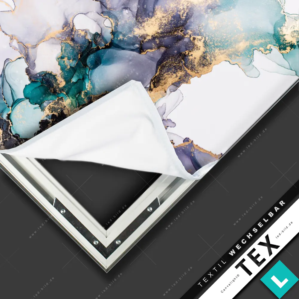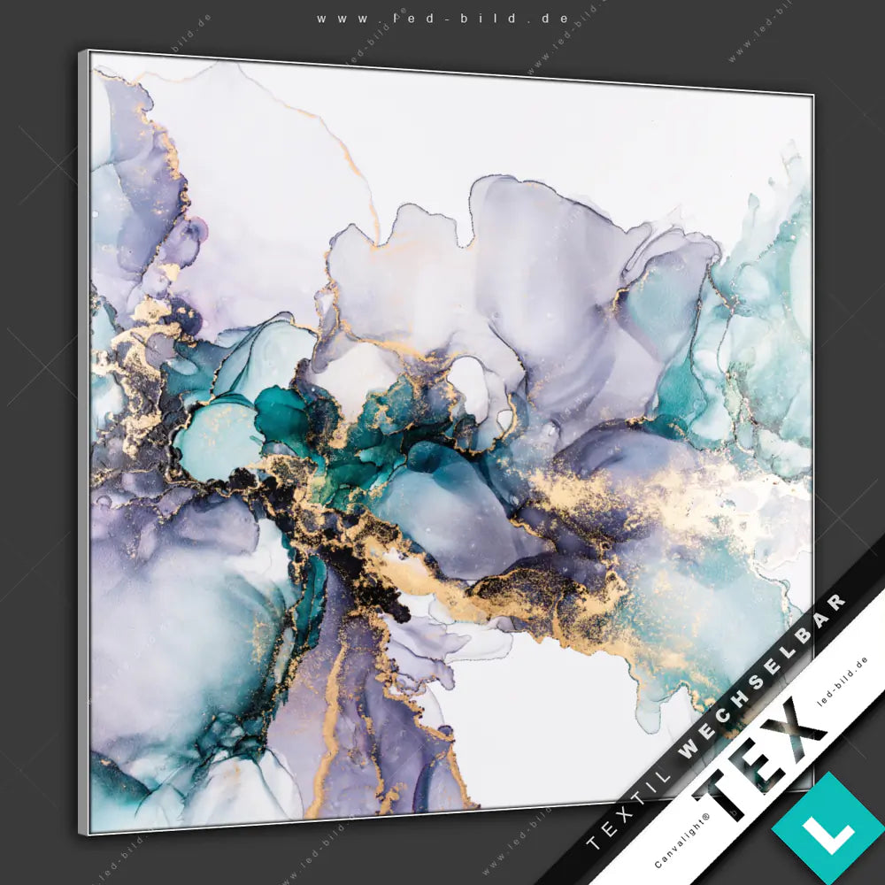 Mit unserem Wechselbild Fluid Painting floral aus der Kategorie Muster - Texturen wird deine Einrichtung auf ein ganz neues Level gehoben und Langeweile hat keine Chance mehr. Wenn du auf der Suche nach einem Spannrahmen-Bild mit Flüssigkeit, Acryl, flüssig, Farbe, Marmorierung, Struktur, Fluid Art bist, dann empfehlen wir dir unser Canvalight® TEX Wandbild Goldzauber in Lila in den aufregenden Motivfarben Türkis, Lila, Gold, Weiss. Gestaltet im Abstrakt, Modern Art Stil ist der Aluminiumrahmen mit wechselbarem Stoffdruck dank Flachkeder-Technik die perfekte Ergänzung zu jedem Einrichtungsstil.