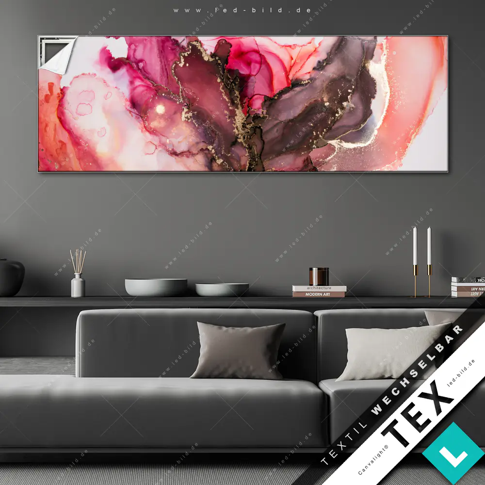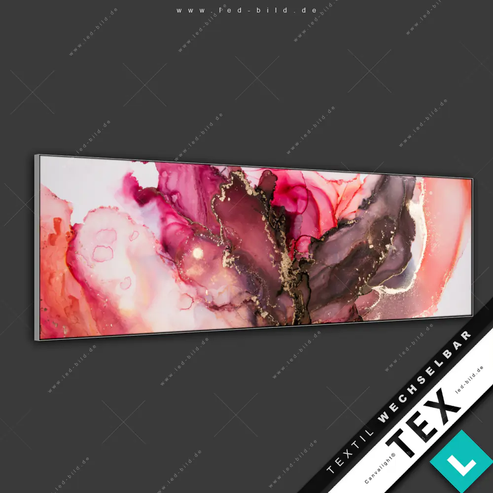 Du hast genug von öden Wänden? Dann ist es höchste Zeit für ein Upgrade mit unserem Canvalight® TEX Wechselbild Fluid Art Rot & Braun im Panorama-Format! Mit diesem stylischen Wandbild mit Wechselrahmen-System wird deine Wohnung eine völlig neue Dimension erreichen!