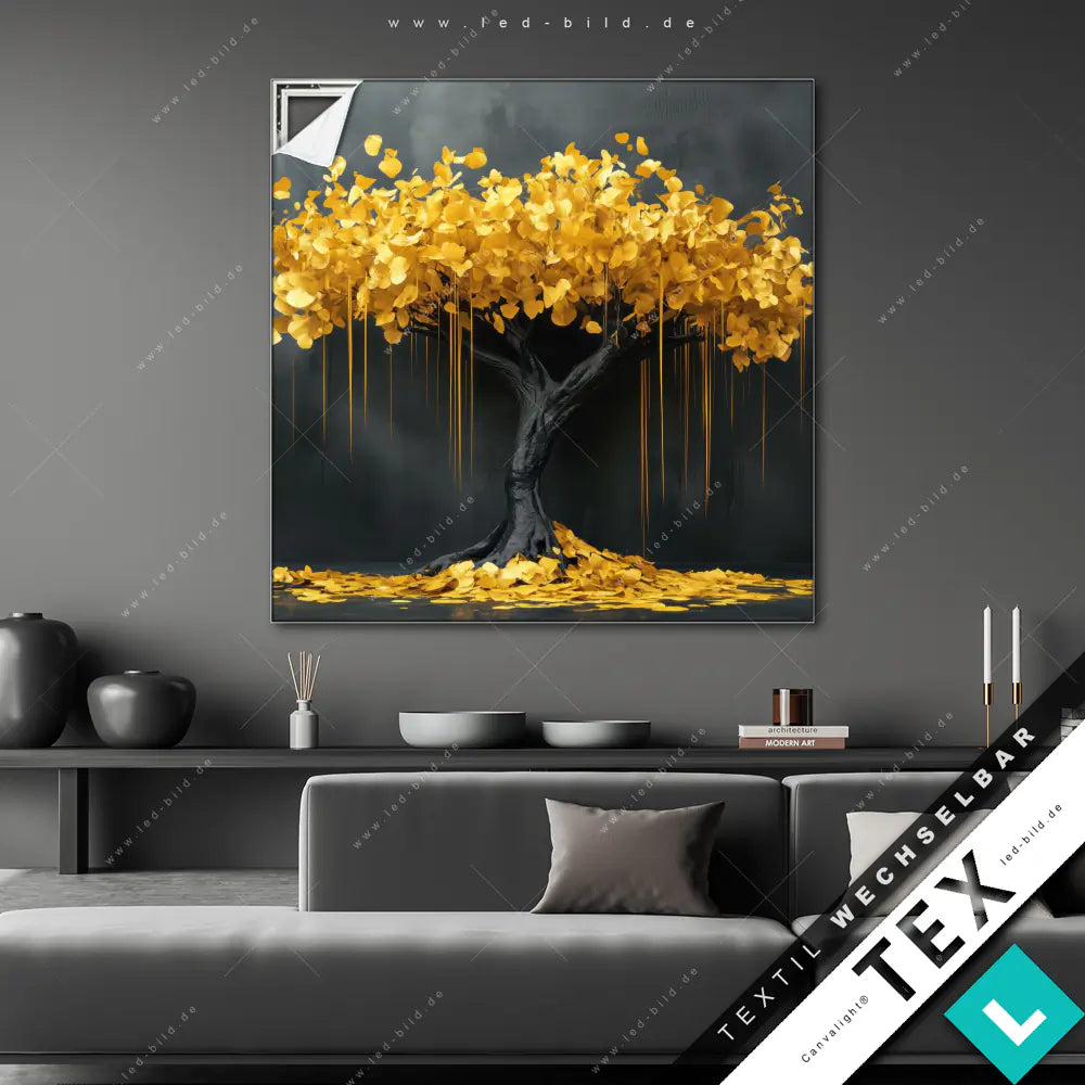 Wir haben das perfekte Spannbild mit austauschbarem Motiv für dich: Unser Textilrahmen-Bild Goldener Lebensbaum im Quadratischen Format wird jeden Raum wie Arzt - Praxis, Büro - Kanzlei, Wohnzimmer - Schlafzimmer, Flur - Eingangsbereich im Handumdrehen aufpeppen!