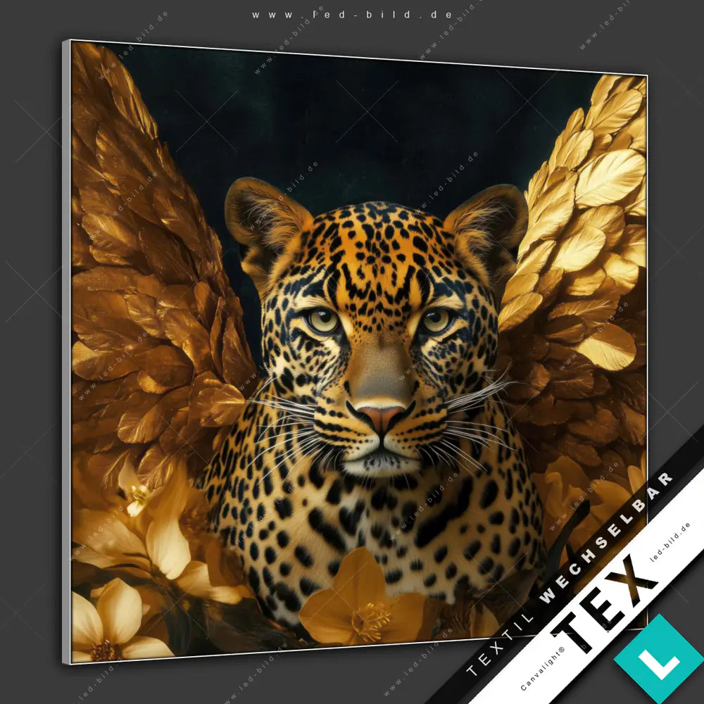 Wir haben das perfekte Spannbild mit austauschbarem Motiv für dich: Unser Textilrahmen-Bild Goldflügel-Leopard im Quadratischen Format wird jeden Raum wie Wohnzimmer - Schlafzimmer, Büro - Kanzlei, Flur - Eingangsbereich im Handumdrehen aufpeppen!