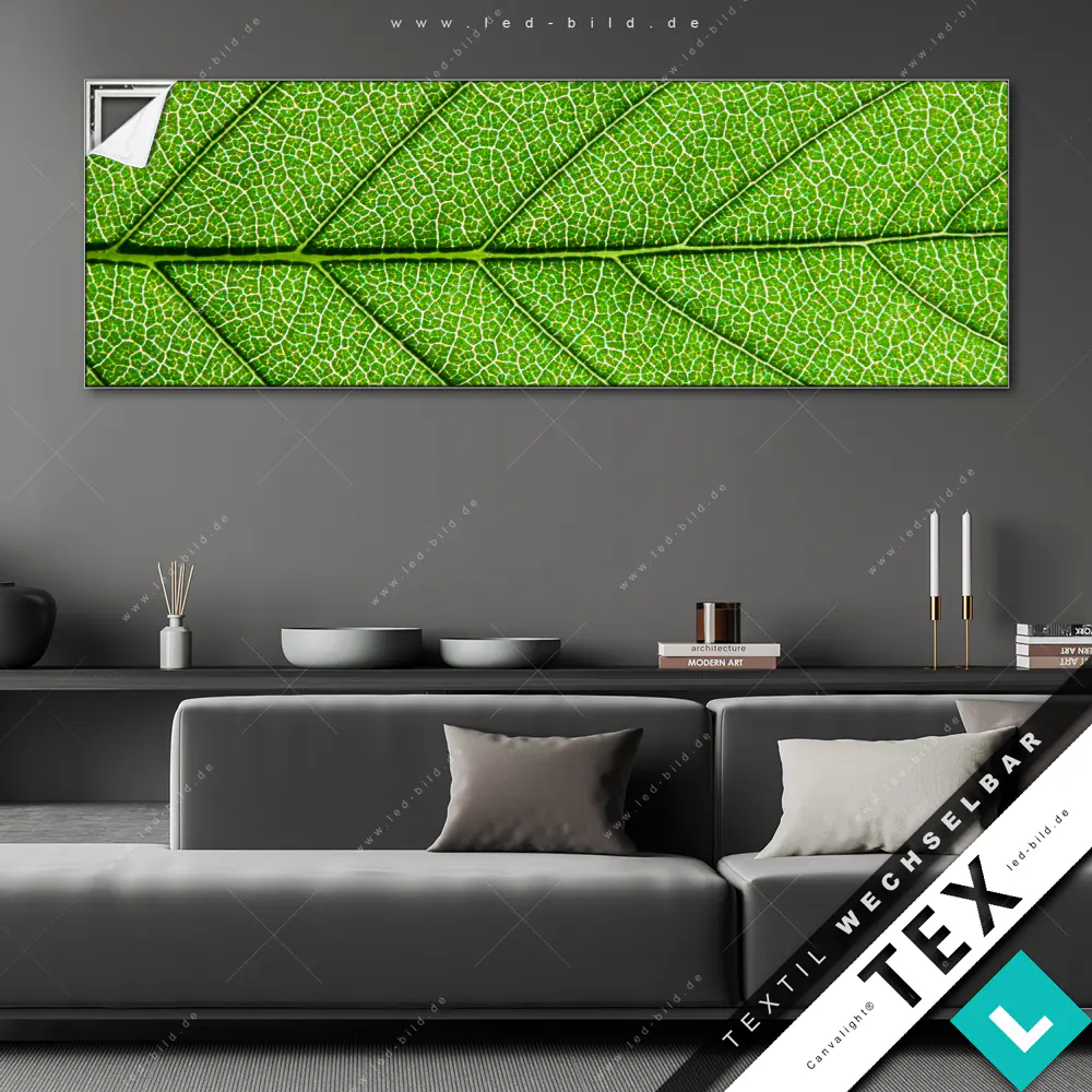 Du hast genug von öden Wänden? Dann ist es höchste Zeit für ein Upgrade mit unserem Canvalight® TEX Wechselbild Grüne Blattadern im Panorama-Format! Mit diesem stylischen Wandbild mit Wechselrahmen-System wird deine Wohnung eine völlig neue Dimension erreichen!