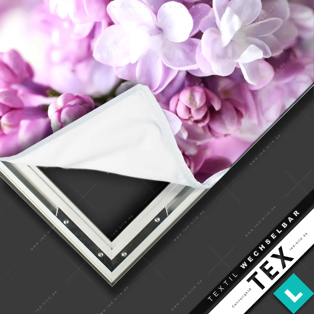 Mit unserem Wechselbild Zarte Blütenpracht in Lila aus der Kategorie Blumen - Botanik wird deine Einrichtung auf ein ganz neues Level gehoben und Langeweile hat keine Chance mehr. Wenn du auf der Suche nach einem Spannrahmen-Bild mit Blumen, Pflanze, Natur, Blüten, Frühling, Sommer, Flieder, Knospen bist, dann empfehlen wir dir unser Canvalight® TEX Wandbild Fliederblüten – Frühling pur erleben in den aufregenden Motivfarben Weiss, Rosa, Lila. Gestaltet im Floral, Modern Art Stil ist der Aluminiumrahmen mit wechselbarem Stoffdruck dank Flachkeder-Technik die perfekte Ergänzung zu jedem Einrichtungsstil.