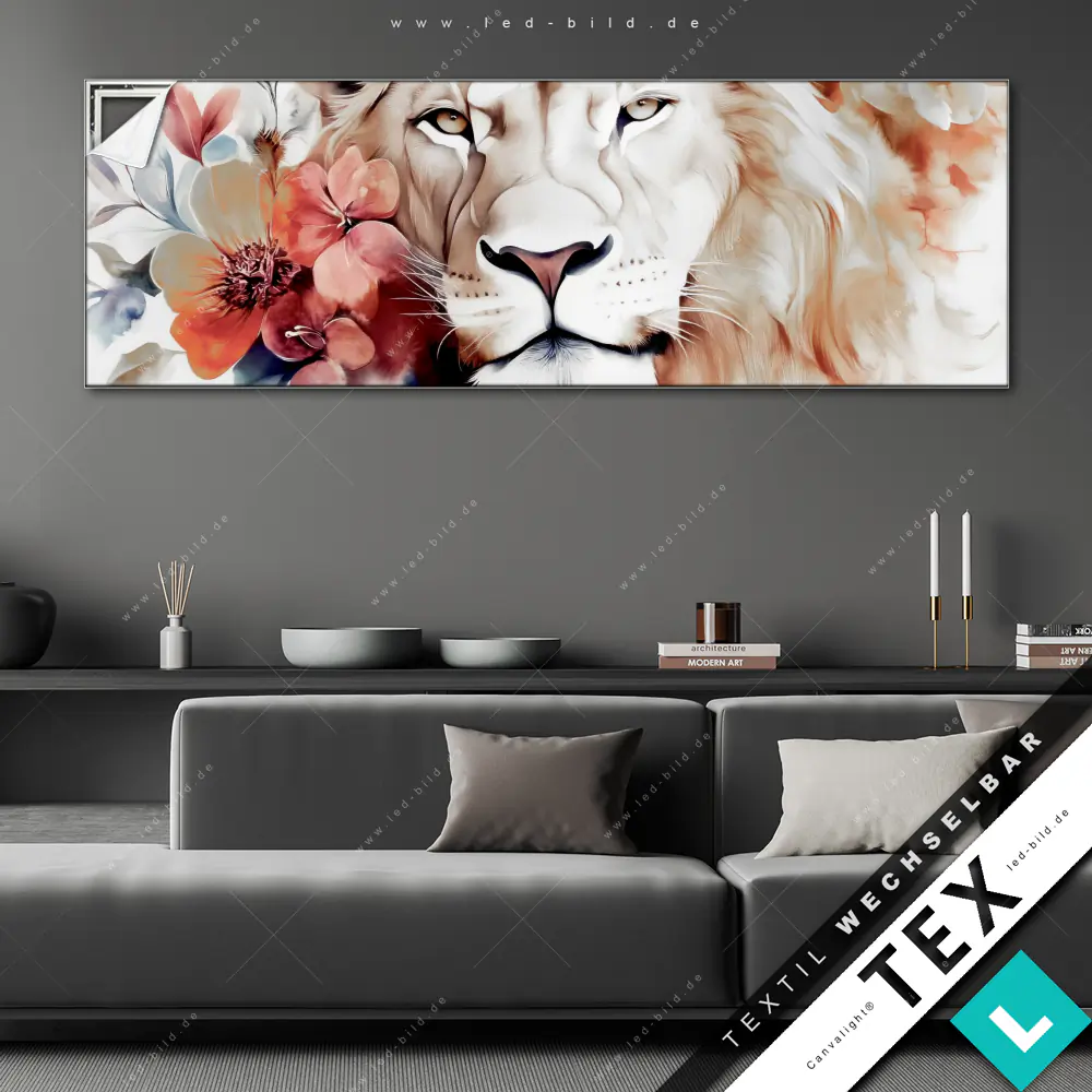 Du hast genug von öden Wänden? Dann ist es höchste Zeit für ein Upgrade mit unserem Canvalight® TEX Wechselbild Löwe mit Blumen im Panorama-Format! Mit diesem stylischen Wandbild mit Wechselrahmen-System wird deine Wohnung eine völlig neue Dimension erreichen!