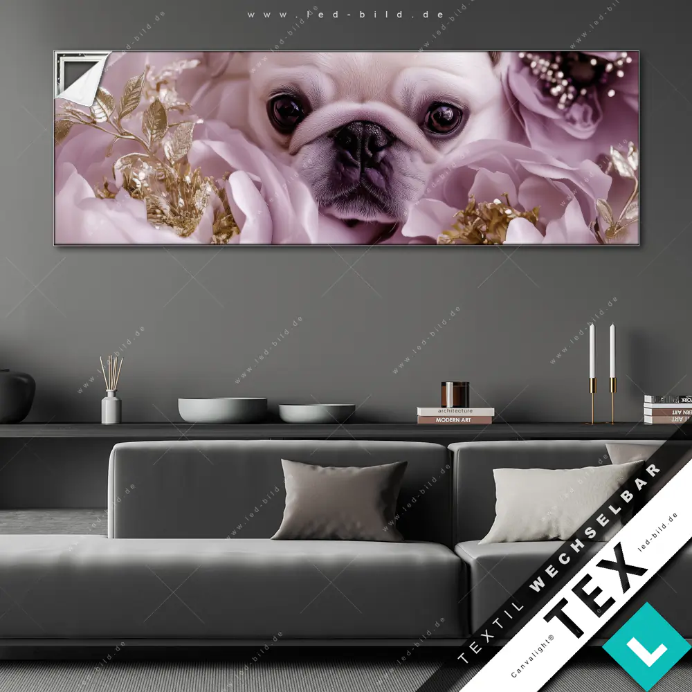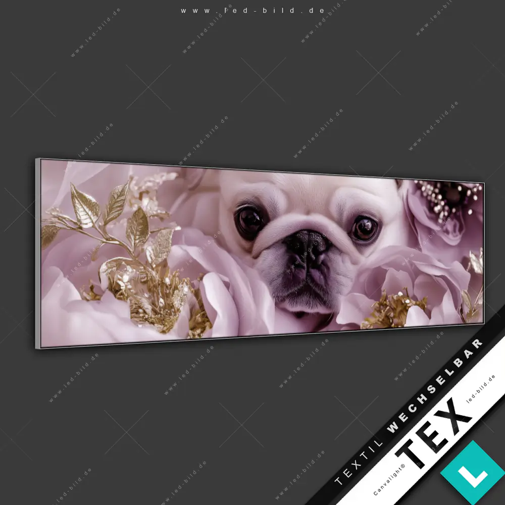 Canvalight® Textilrahmen | Mops im Blütenmeer | Panorama