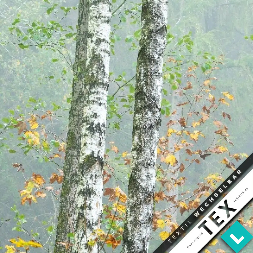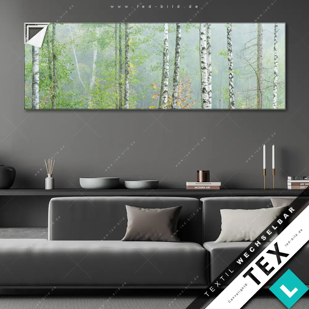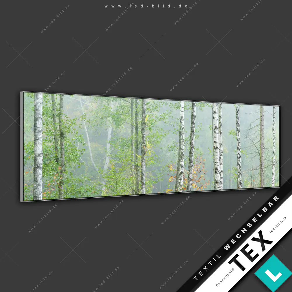 Canvalight® Textilrahmen | Nebliger Birkenwald | Panorama