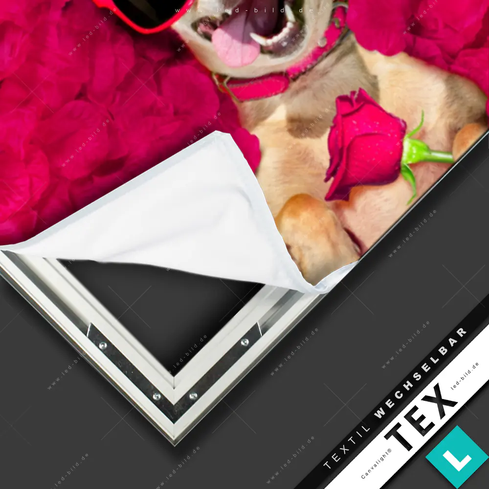 Du hast genug von öden Wänden? Dann ist es höchste Zeit für ein Upgrade mit unserem Canvalight® TEX Wechselbild Romantik mit süßen Hunden im Panorama-Format! Mit diesem stylischen Wandbild mit Wechselrahmen-System wird deine Wohnung eine völlig neue Dimension erreichen!