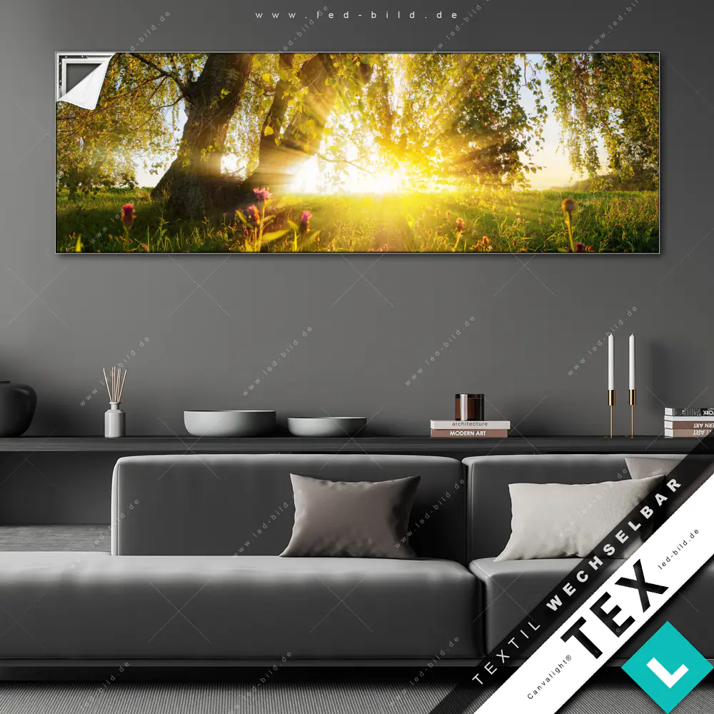 Du hast genug von öden Wänden? Dann ist es höchste Zeit für ein Upgrade mit unserem Canvalight® TEX Wechselbild Unberührte Natur im Panorama-Format! Mit diesem stylischen Wandbild mit Wechselrahmen-System wird deine Wohnung eine völlig neue Dimension erreichen!