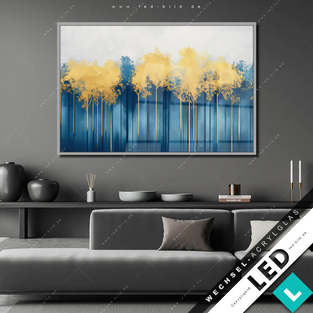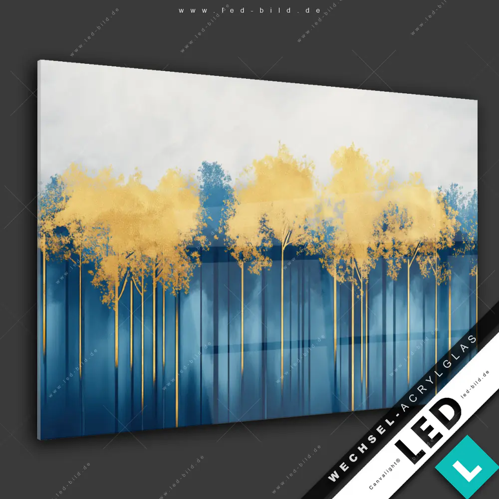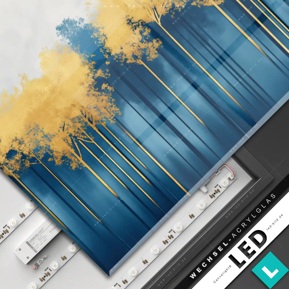 Canvalight® Wechsel-Acrylglas | Abstrakter Wald - Blau & Gold | Querformat