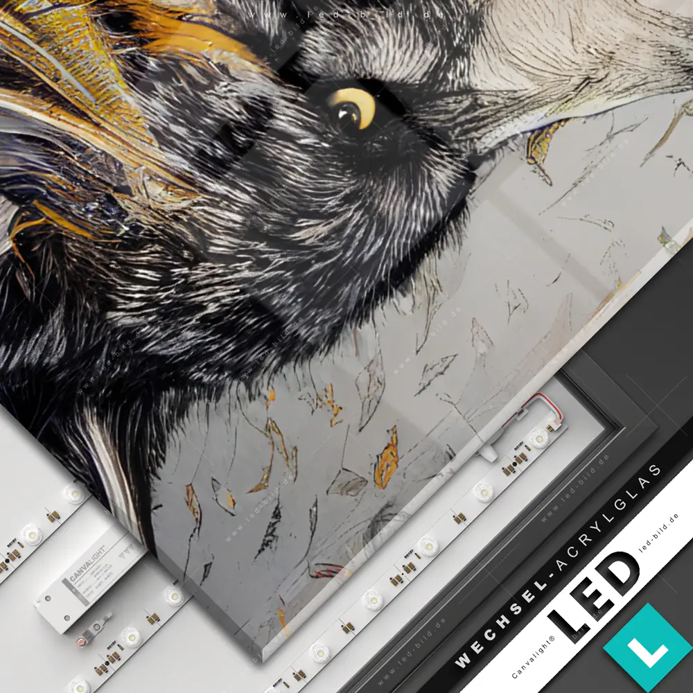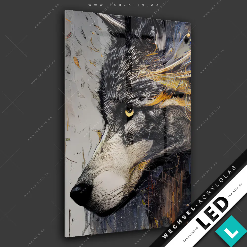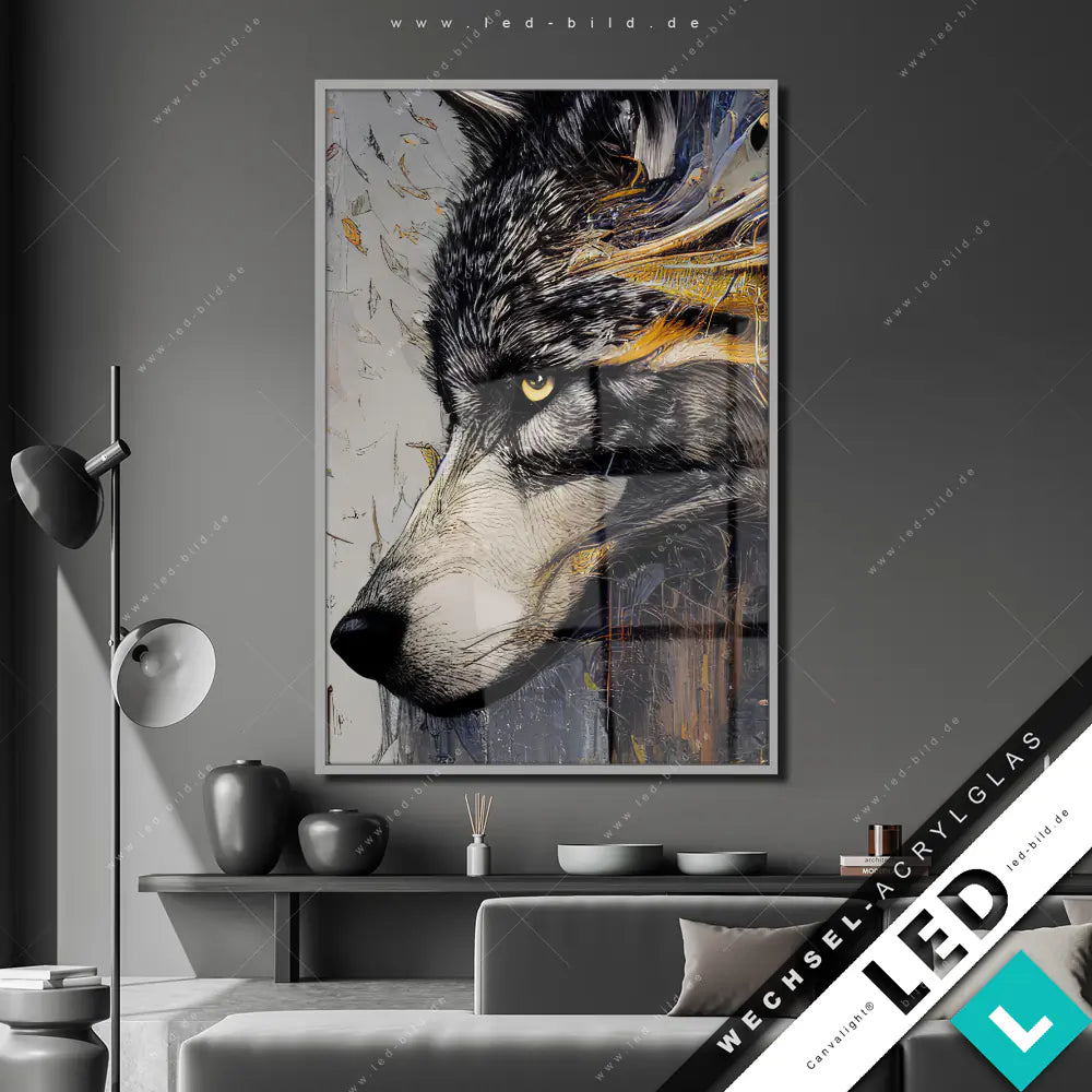 Canvalight® Wechsel-Acrylglas | Abstrakter Wolf in Gold und Grau | Hochformat