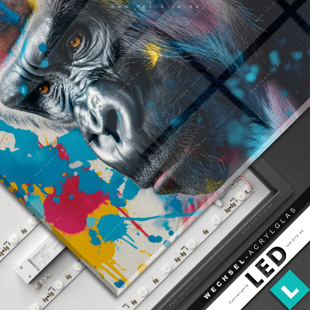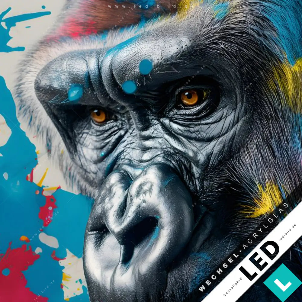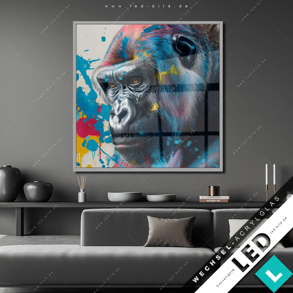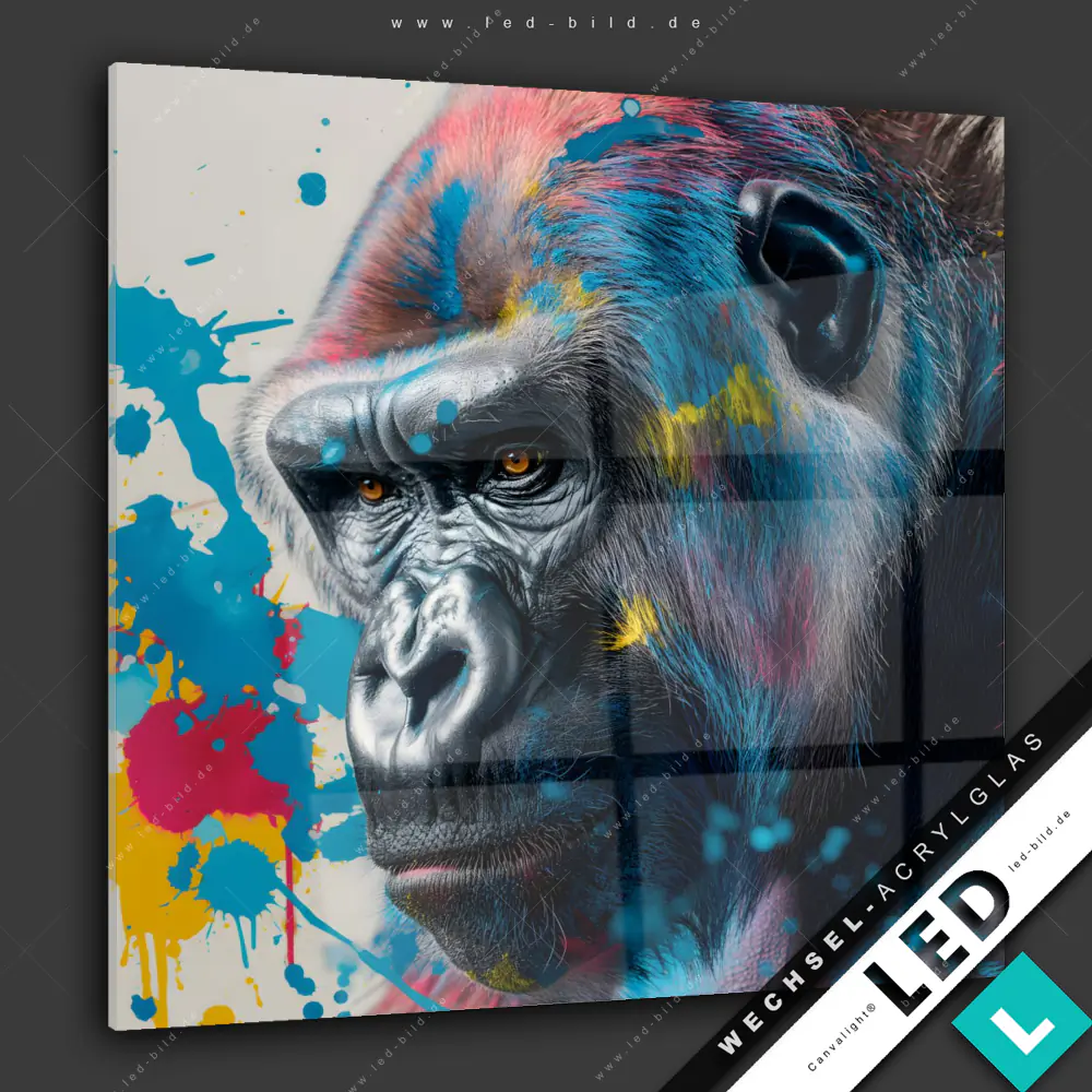Canvalight® Wechsel-Acrylglas | Bunter Gorilla mit Farbspritzern | Quadrat
