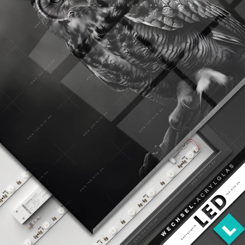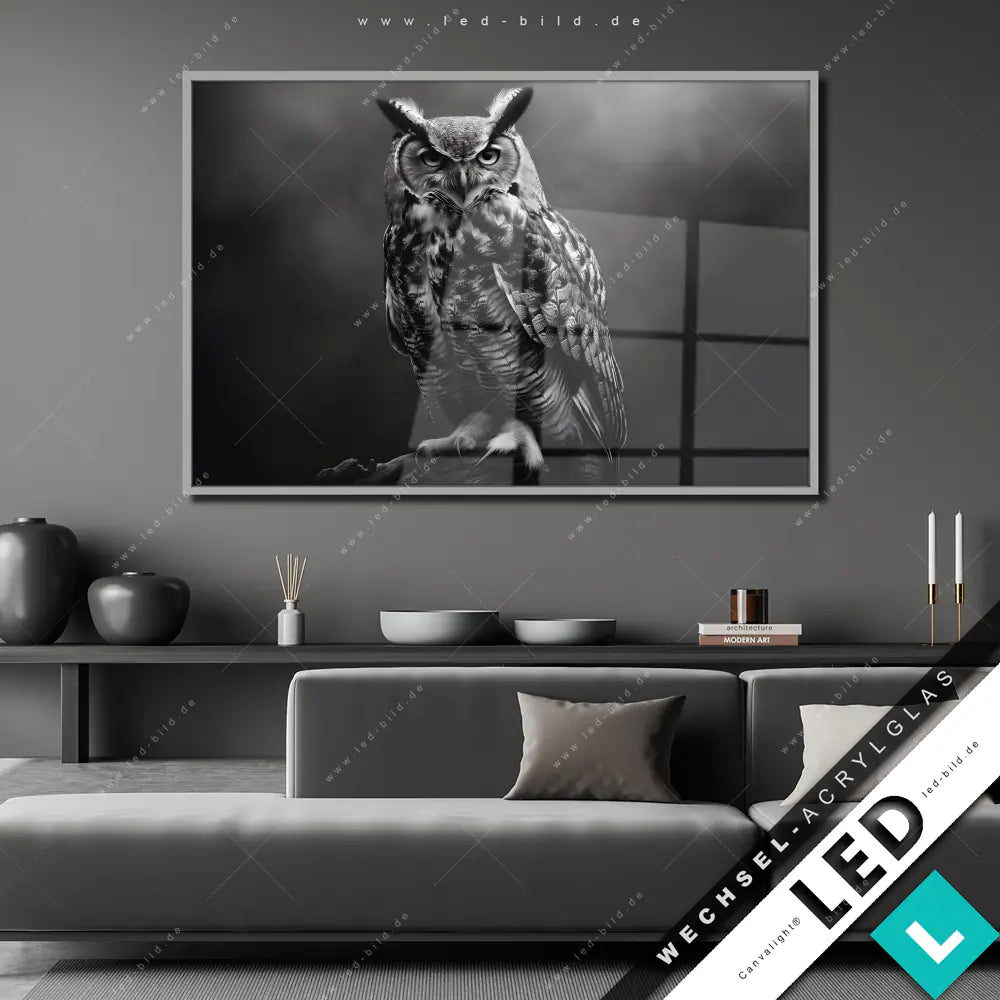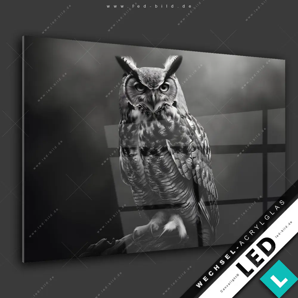 Canvalight® Wechsel-Acrylglas | Düstere Eleganz der Eule | Querformat