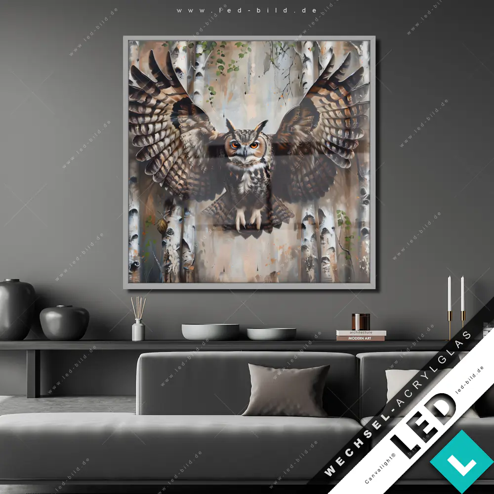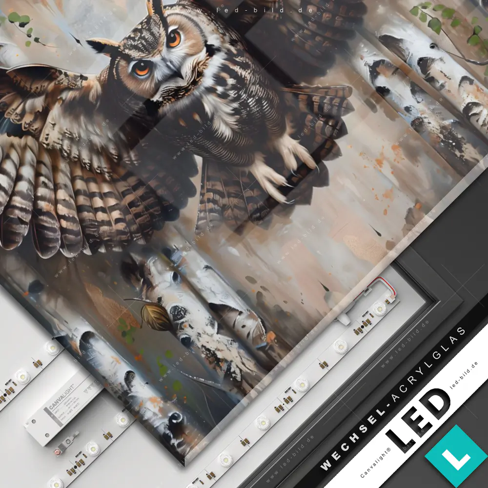 Canvalight® Wechsel-Acrylglas | Eule im Birkenwald | Quadrat