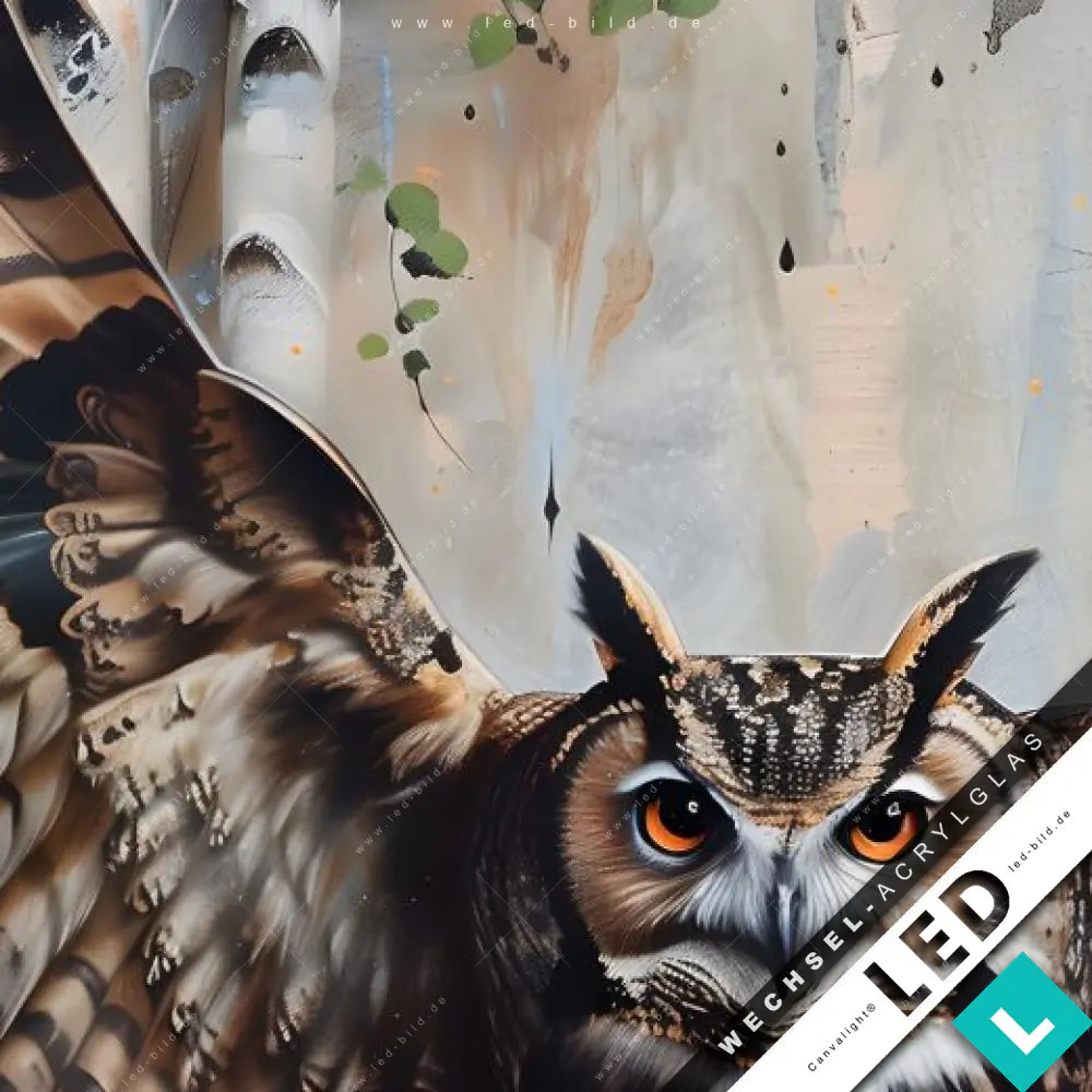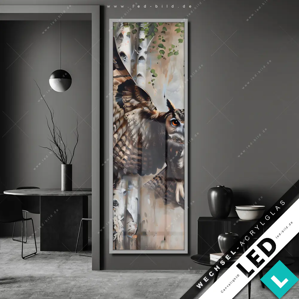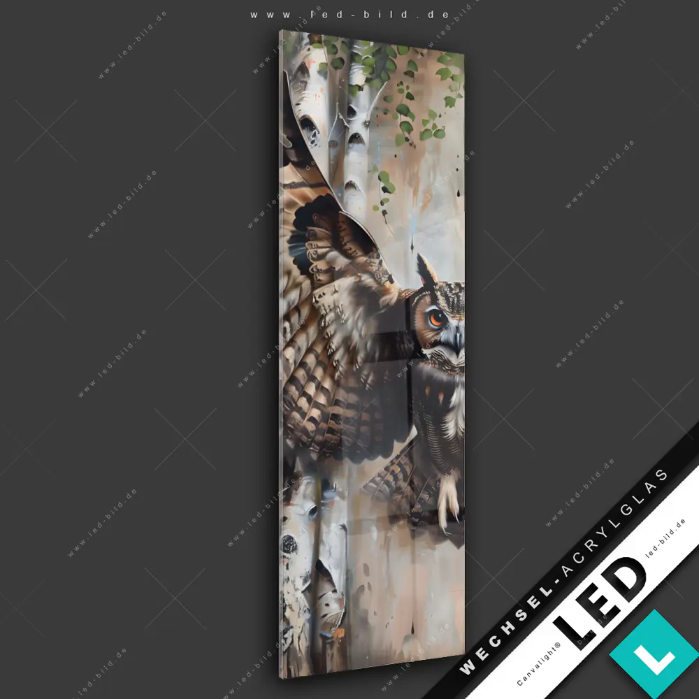 Canvalight® Wechsel-Acrylglas | Eule im Birkenwald | Schmal