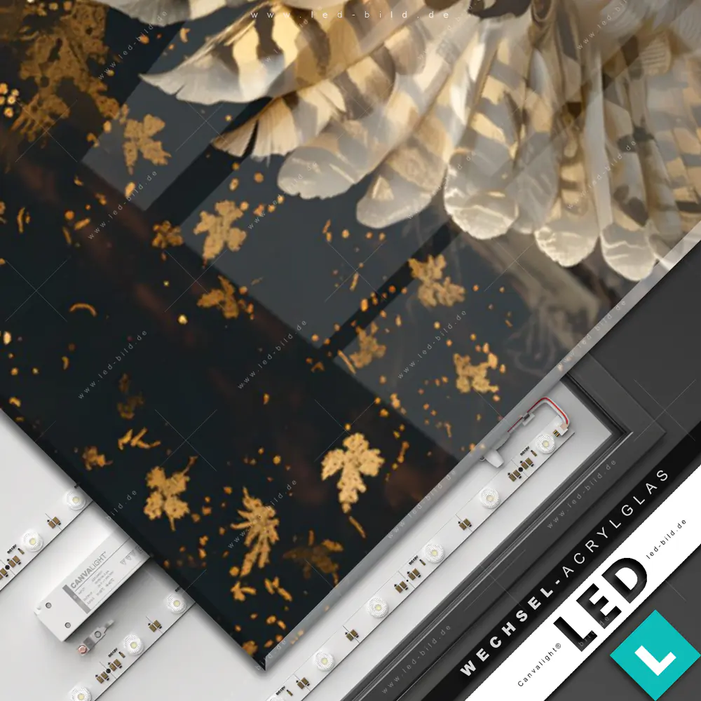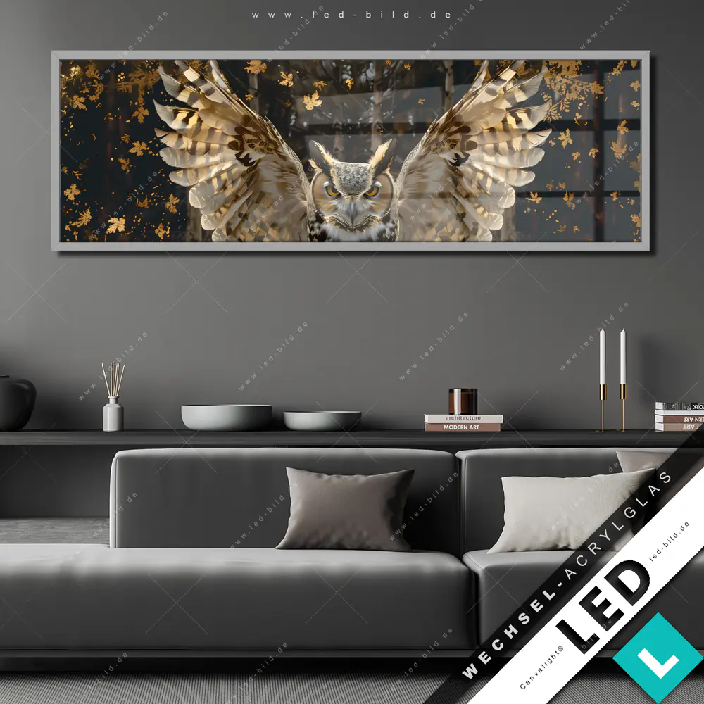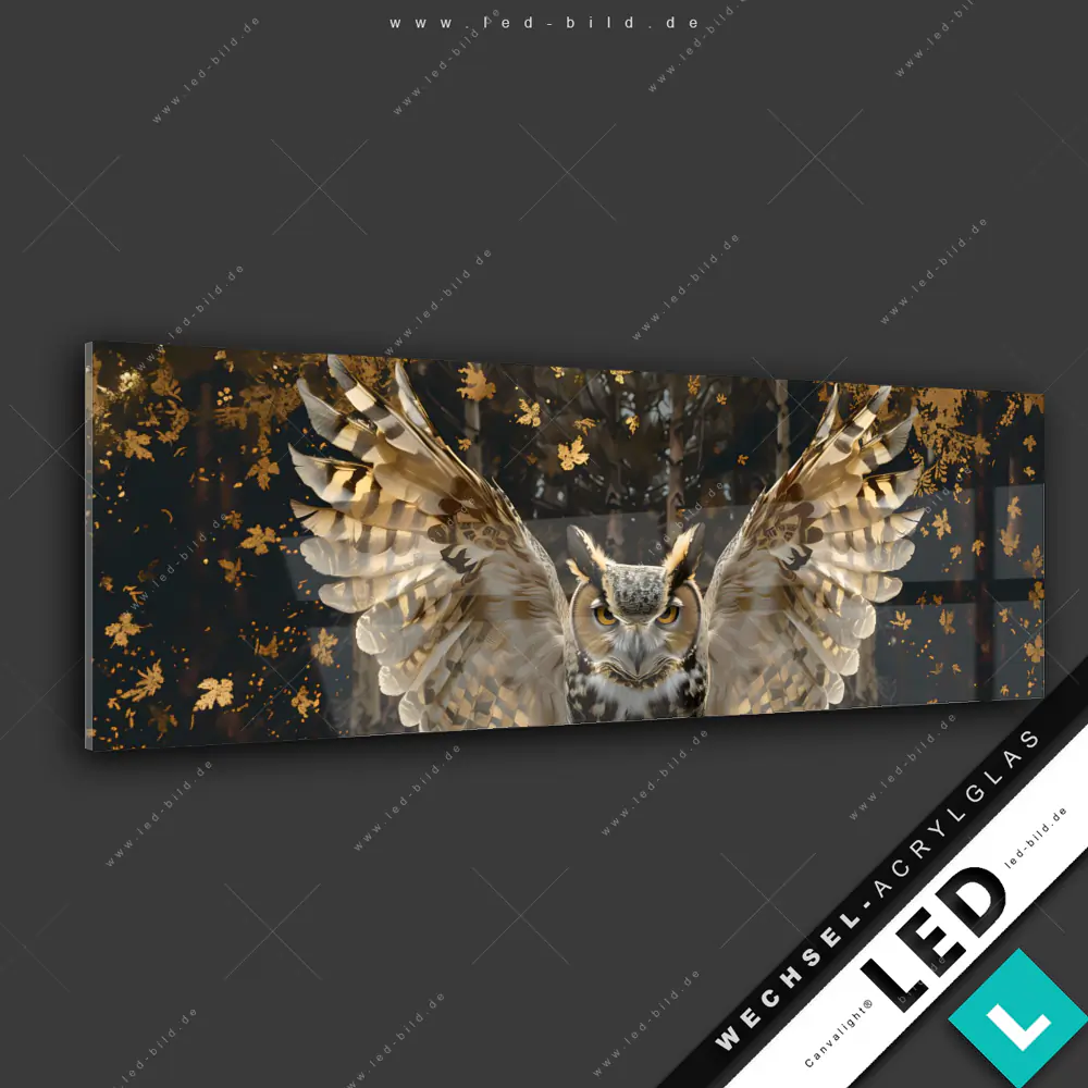 Canvalight® Wechsel-Acrylglas | Eule inmitten goldener Blätter | Panorama