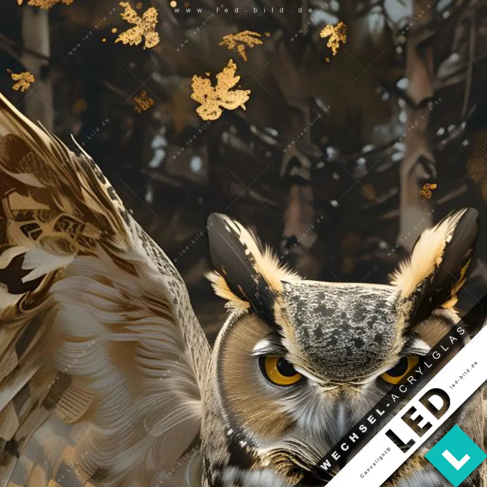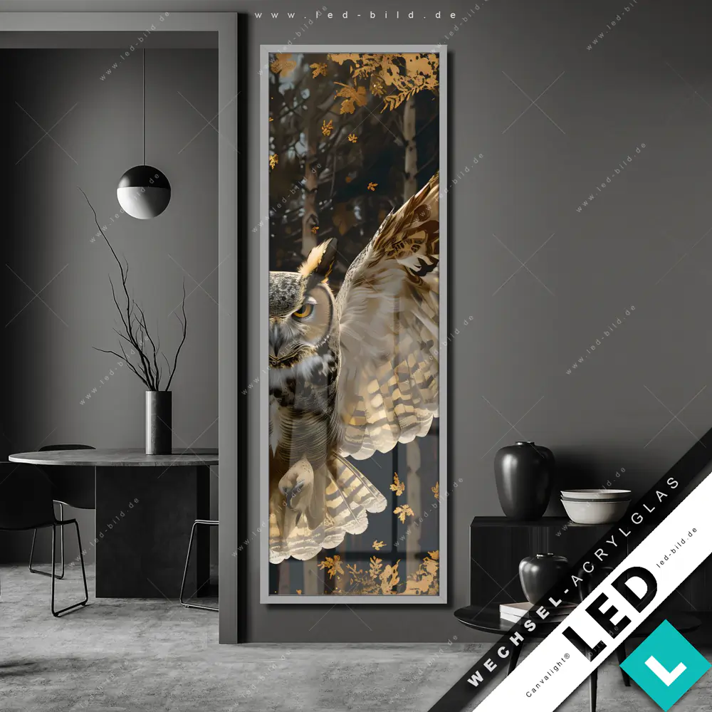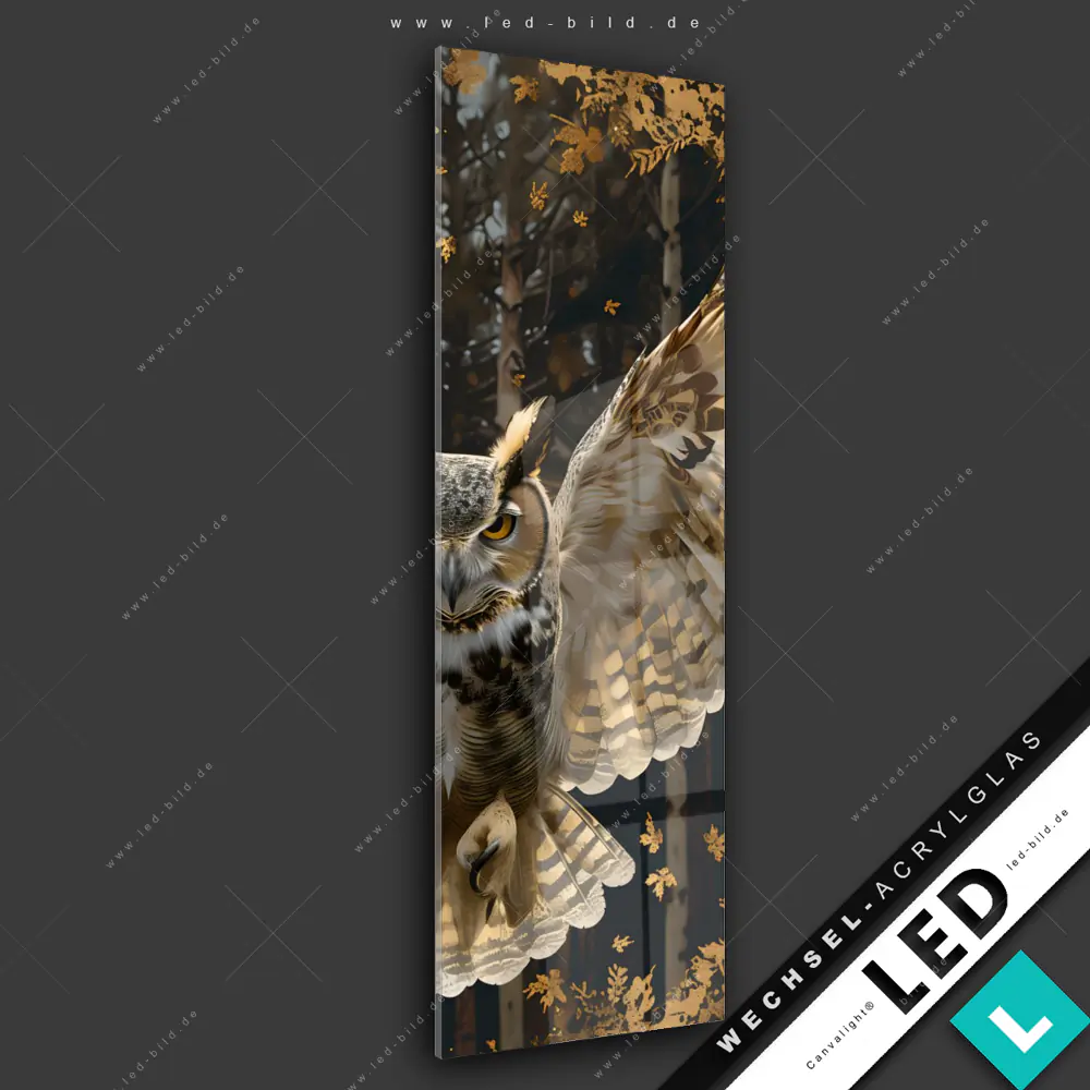 Canvalight® Wechsel-Acrylglas | Eule inmitten goldener Blätter | Schmal
