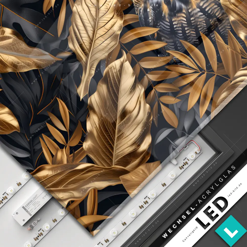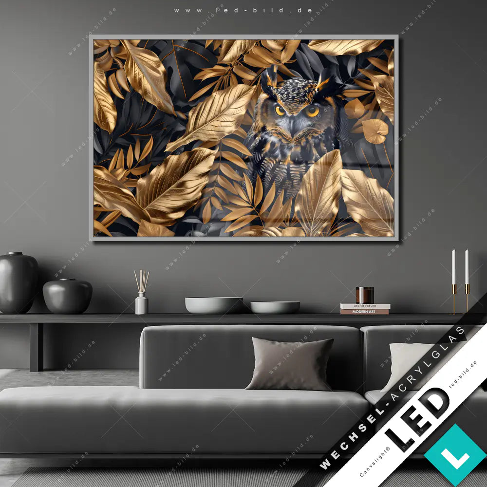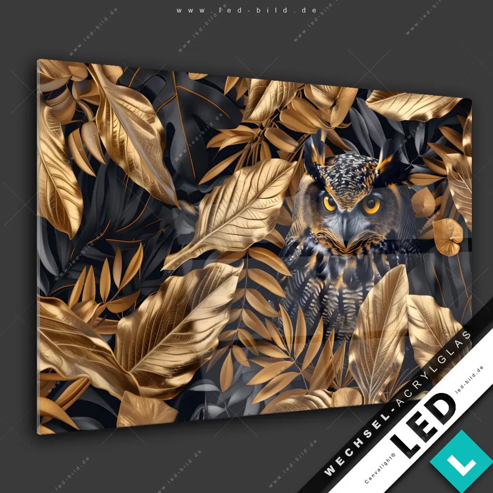 Canvalight® Wechsel-Acrylglas | Eule und goldene Blätter | Querformat
