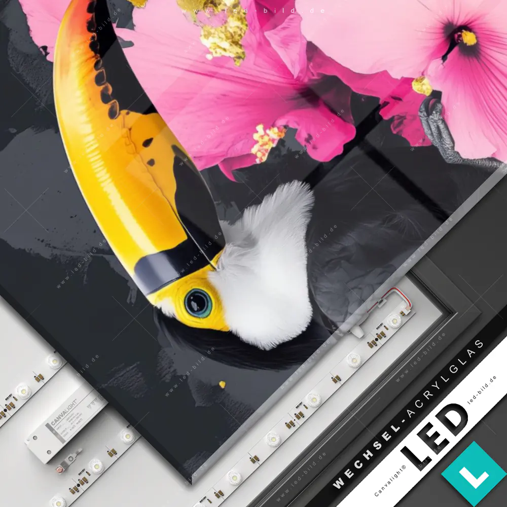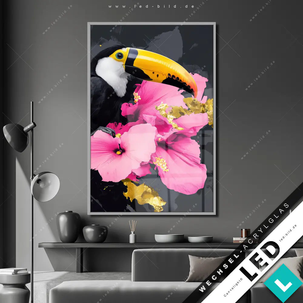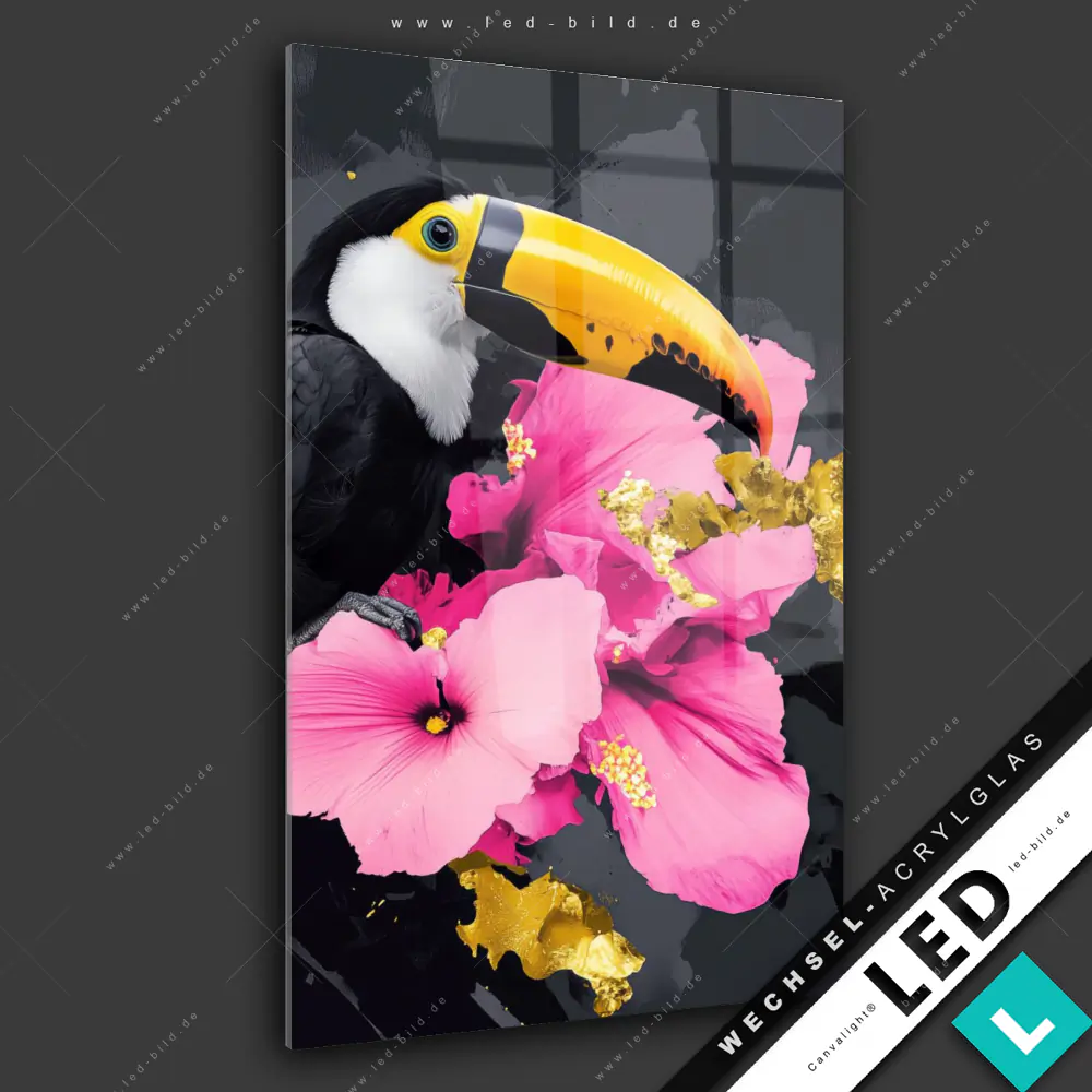 Canvalight® Wechsel-Acrylglas | Exotischer Tukan mit Blüten | Hochformat