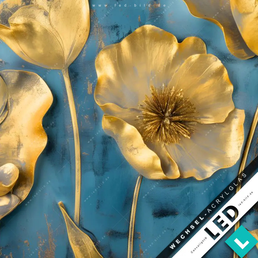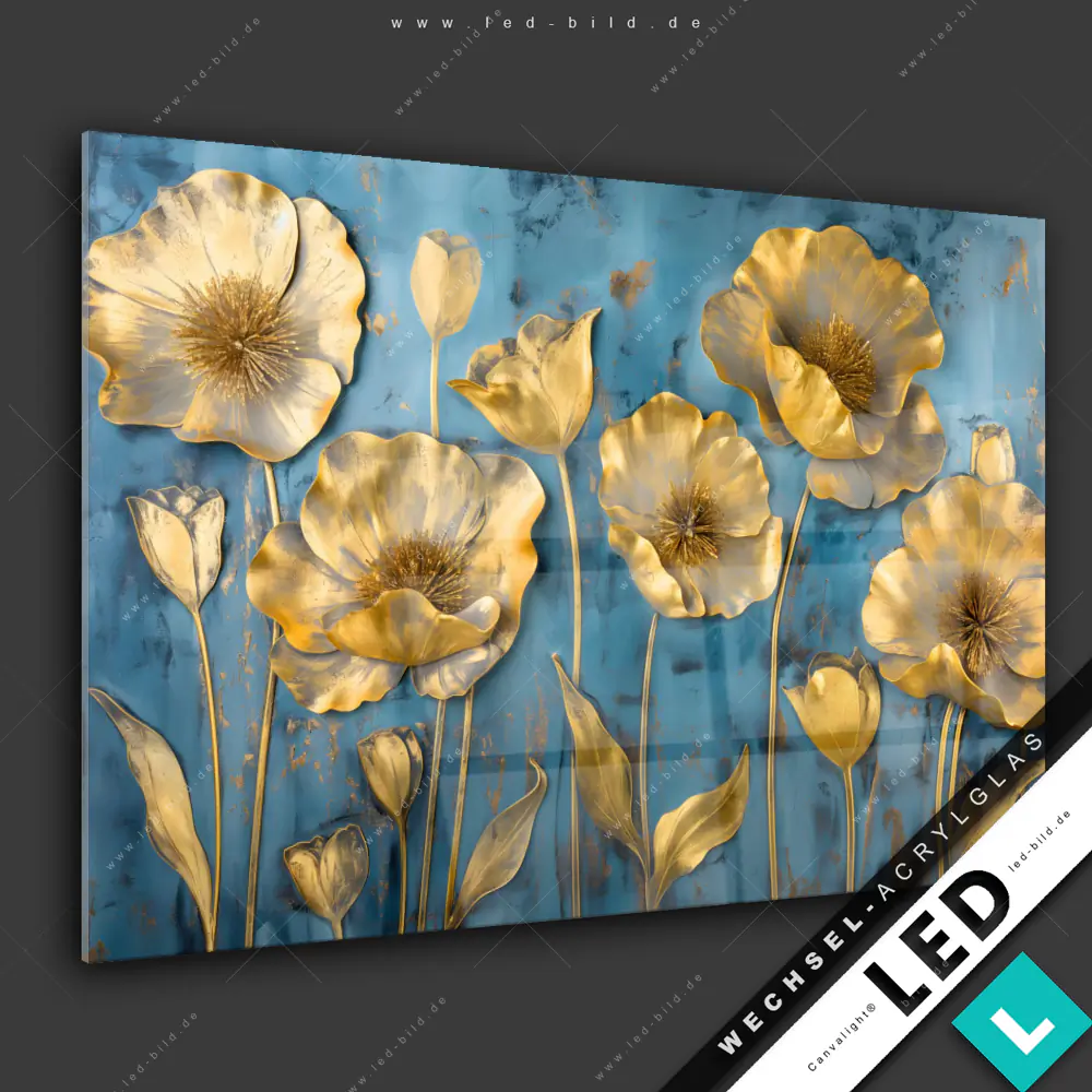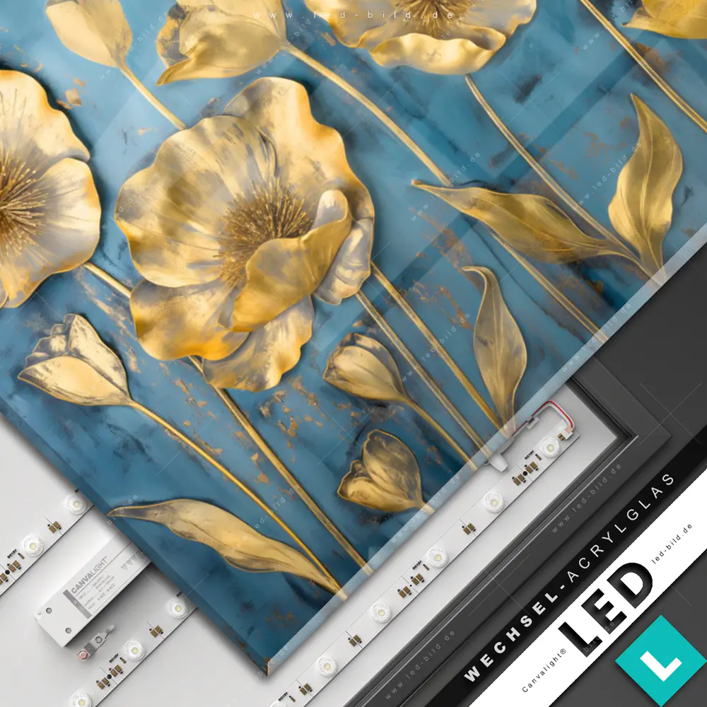 Canvalight® Wechsel-Acrylglas | Goldene Blumen auf Blau | Querformat