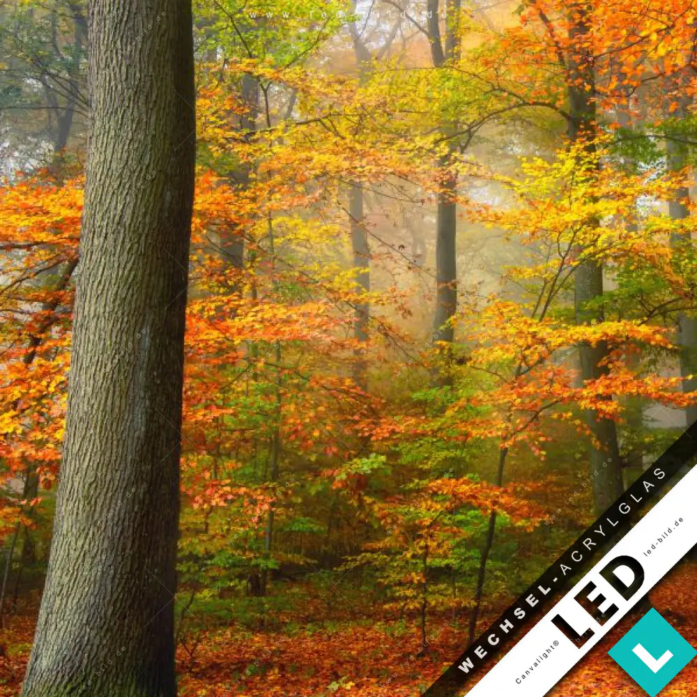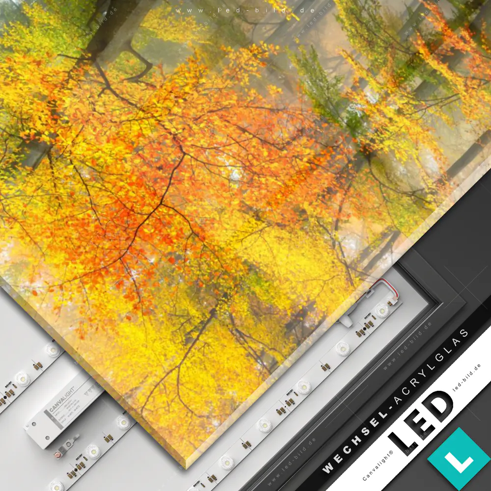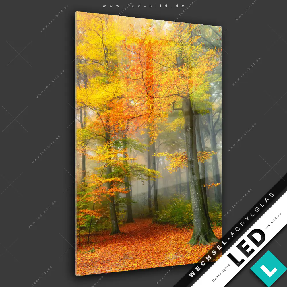 Canvalight® Wechsel-Acrylglas | Herbstfarben im nebligen Wald | Hochformat