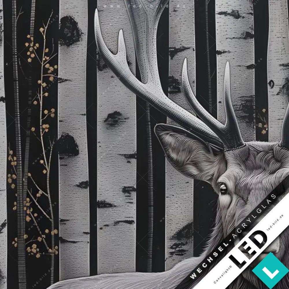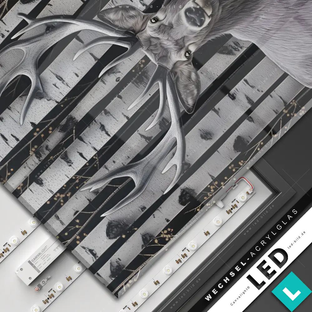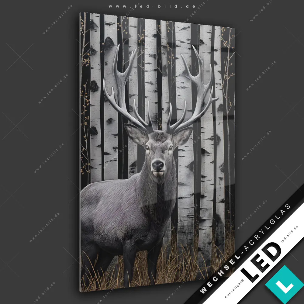 Canvalight® Wechsel-Acrylglas | Hirschporträt vor Birken | Hochformat