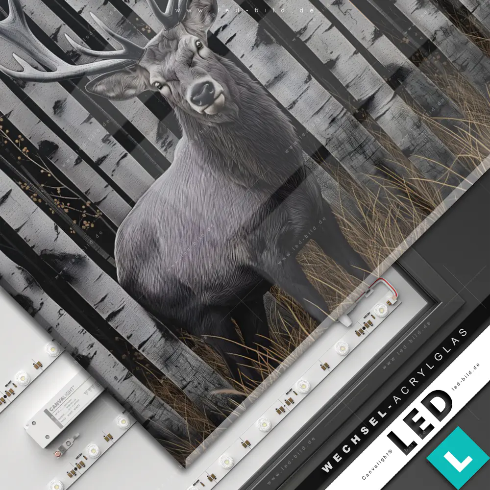 Canvalight® Wechsel-Acrylglas | Hirschporträt vor Birken | Quadrat