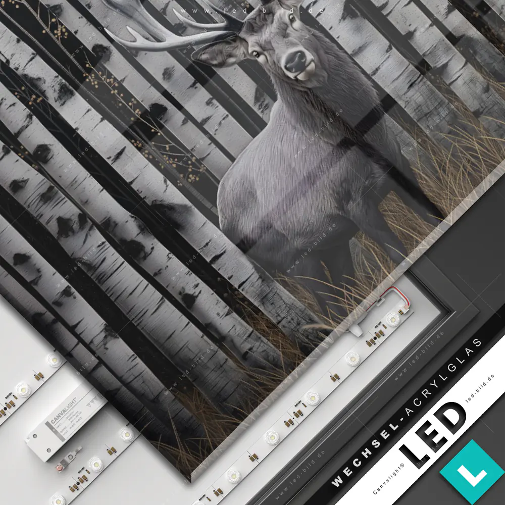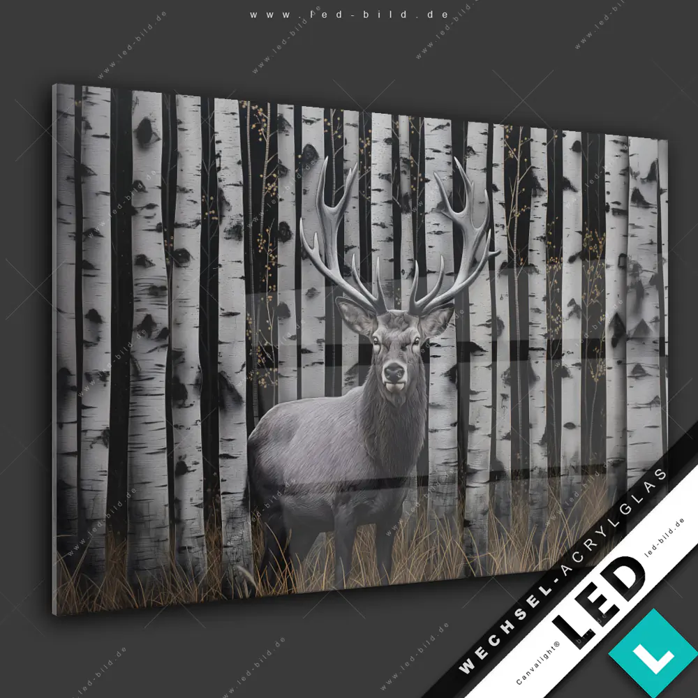 Canvalight® Wechsel-Acrylglas | Hirschporträt vor Birken | Querformat