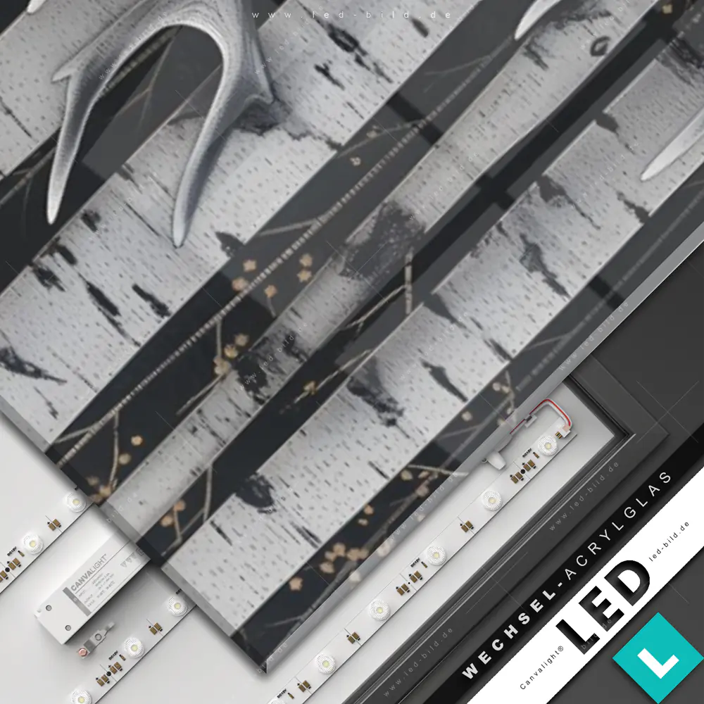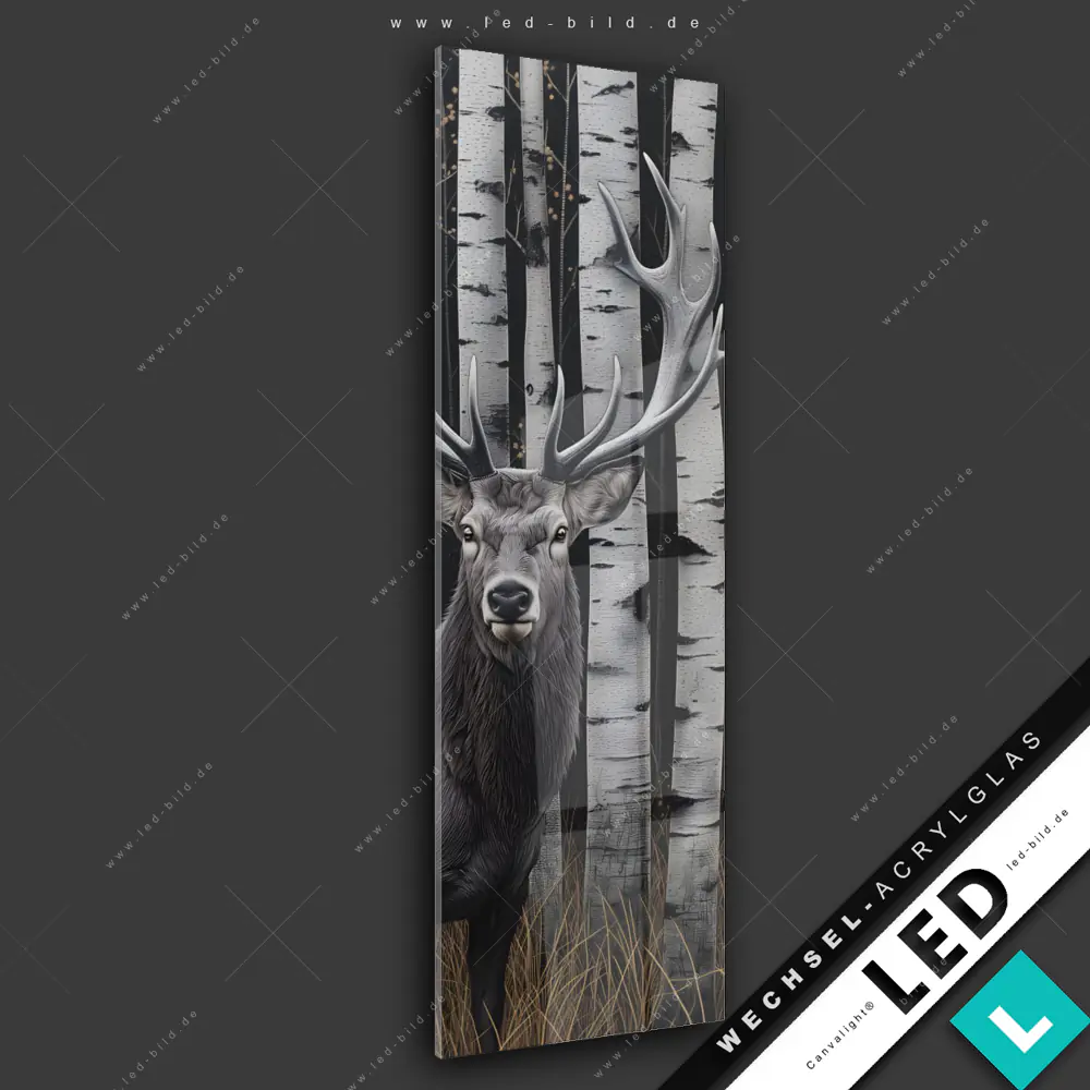 Canvalight® Wechsel-Acrylglas | Hirschporträt vor Birken | Schmal