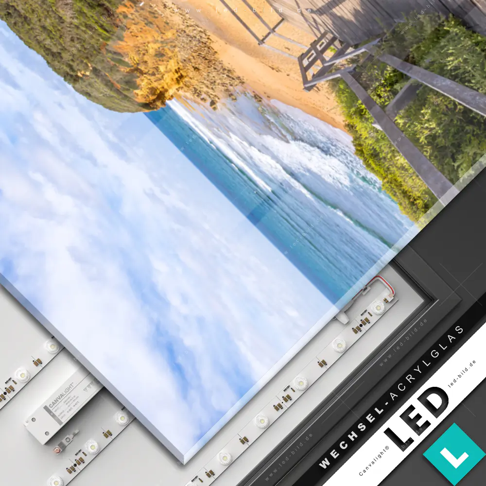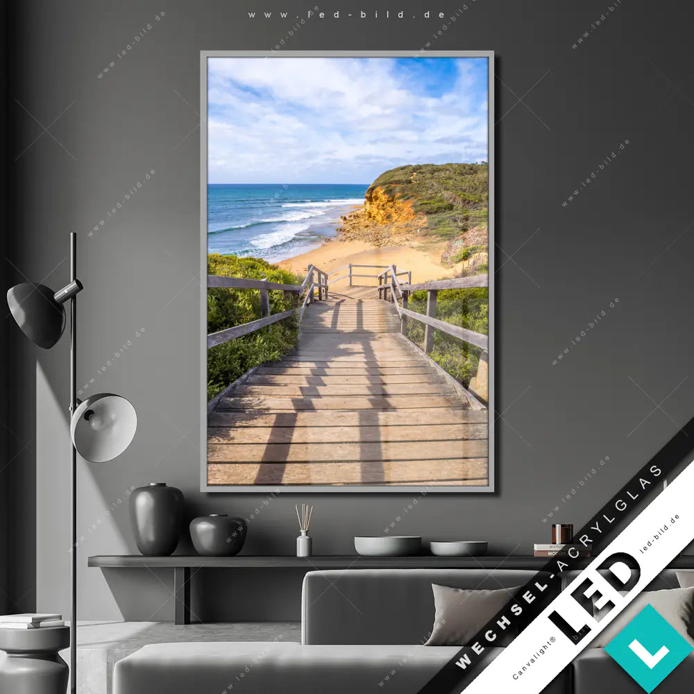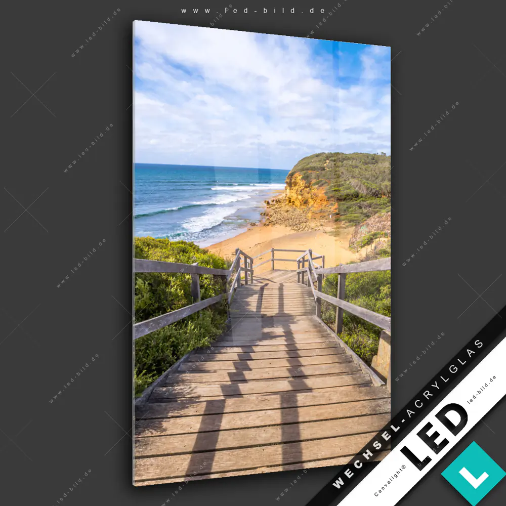 Canvalight® Wechsel-Acrylglas | Holztreppe zum einsamen Strand | Hochformat
