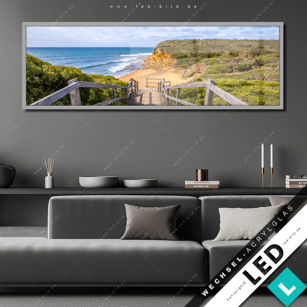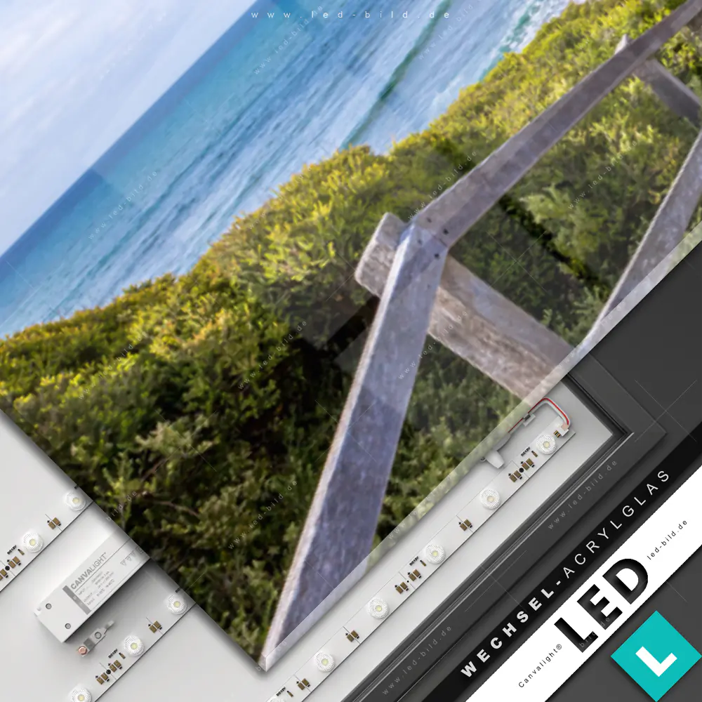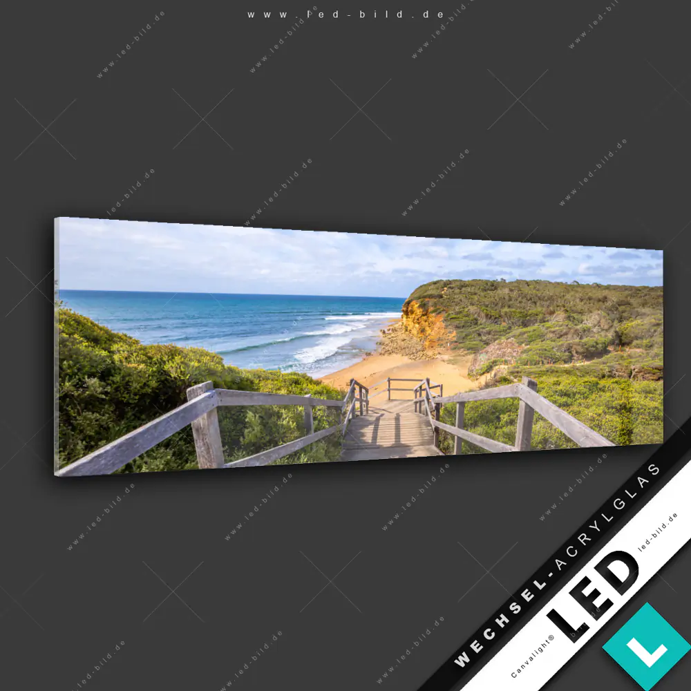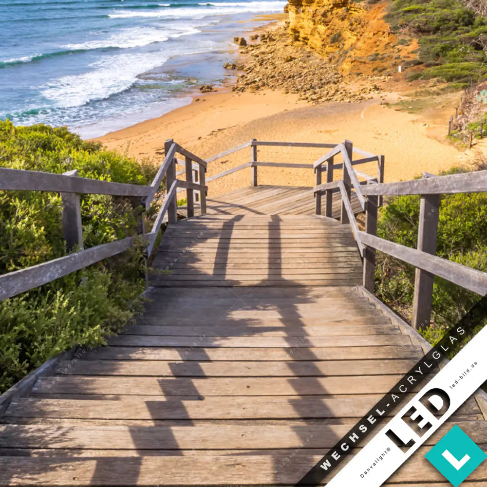 Canvalight® Wechsel-Acrylglas | Holztreppe zum einsamen Strand | Panorama