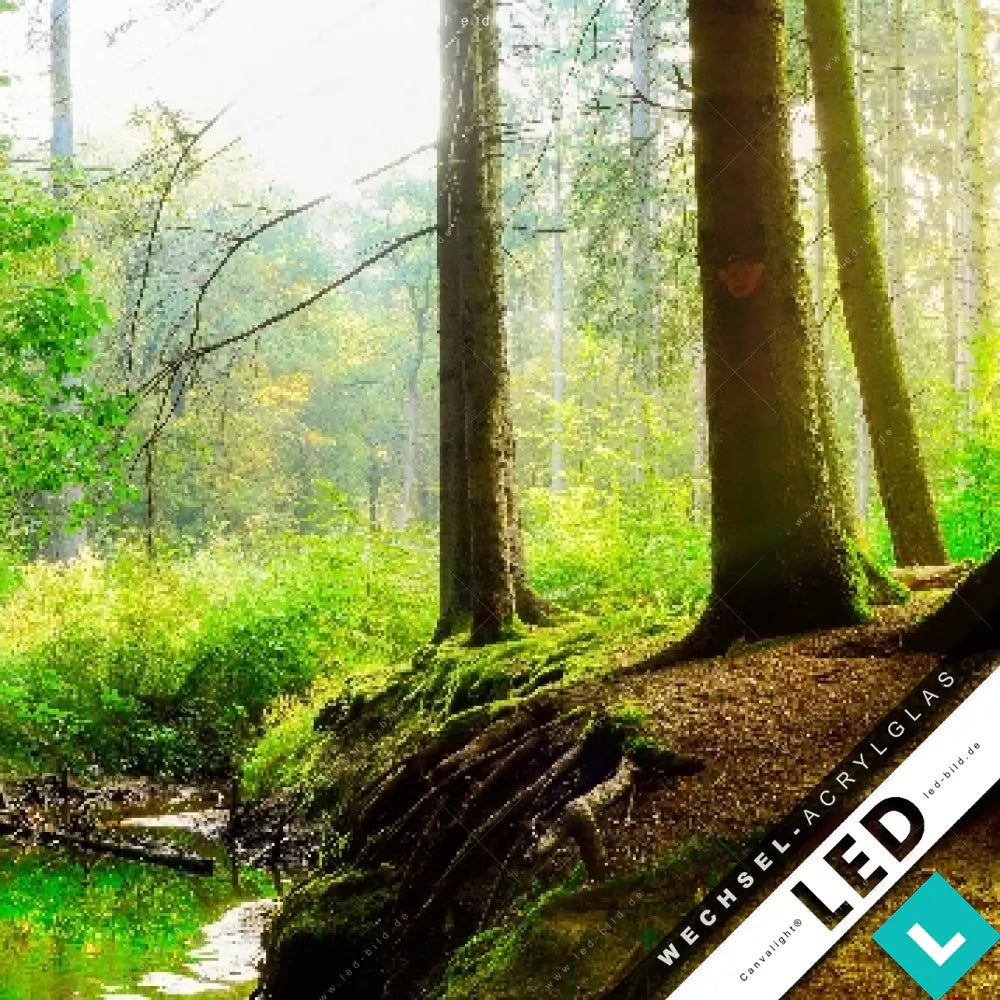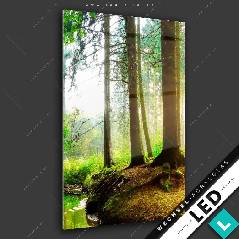 Canvalight® Wechsel-Acrylglas | Idyllischer Wald bei Sonnenaufgang | Hochformat