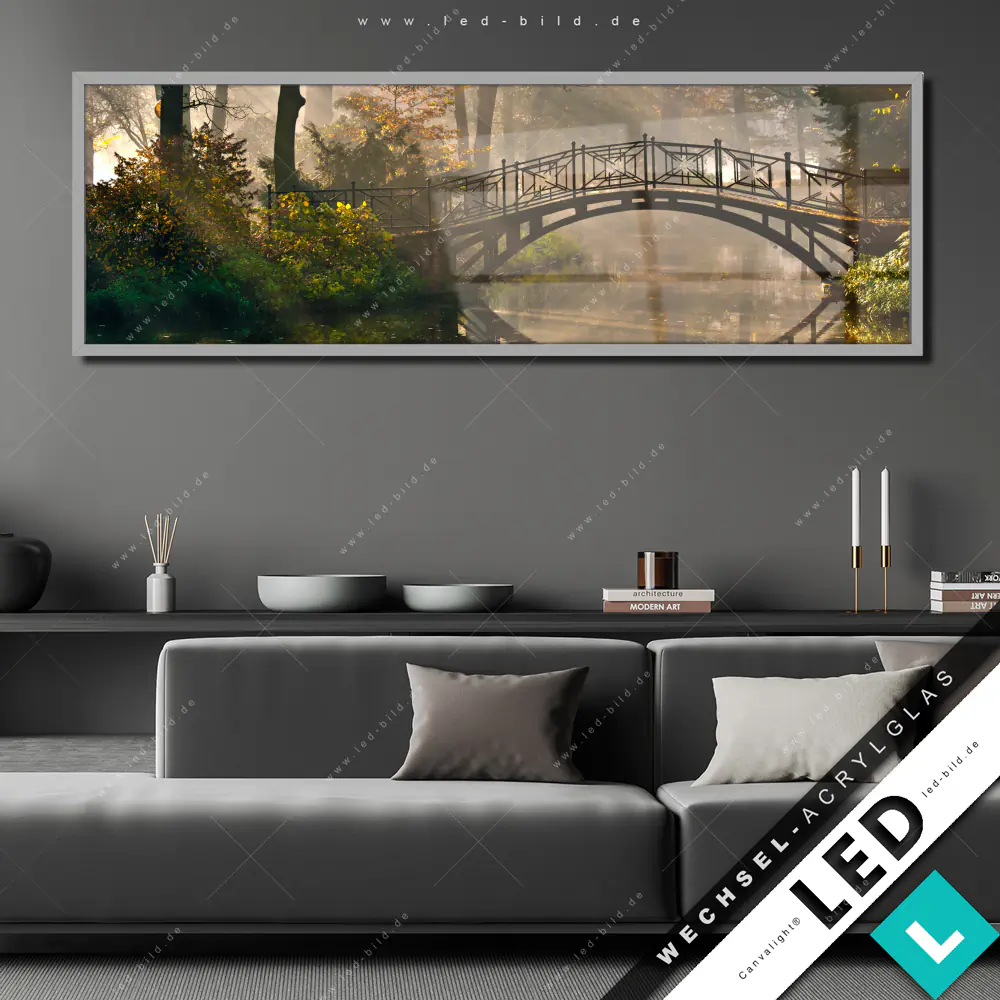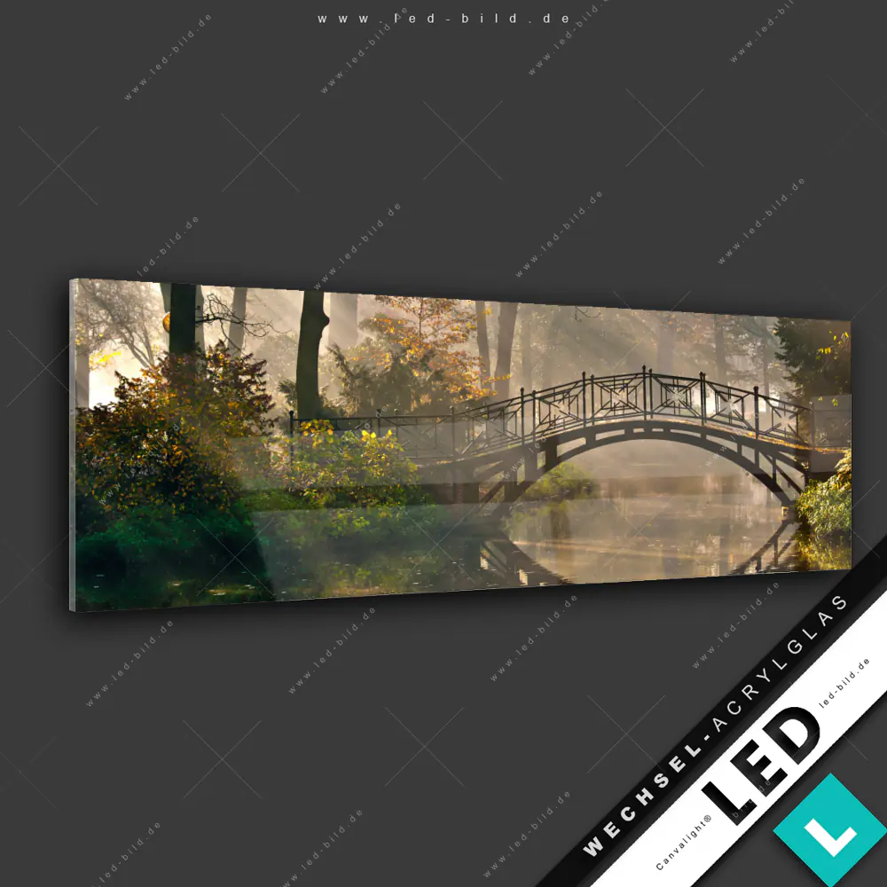Canvalight® Wechsel-Acrylglas | Idyllischer Wald mit Brücke | Panorama