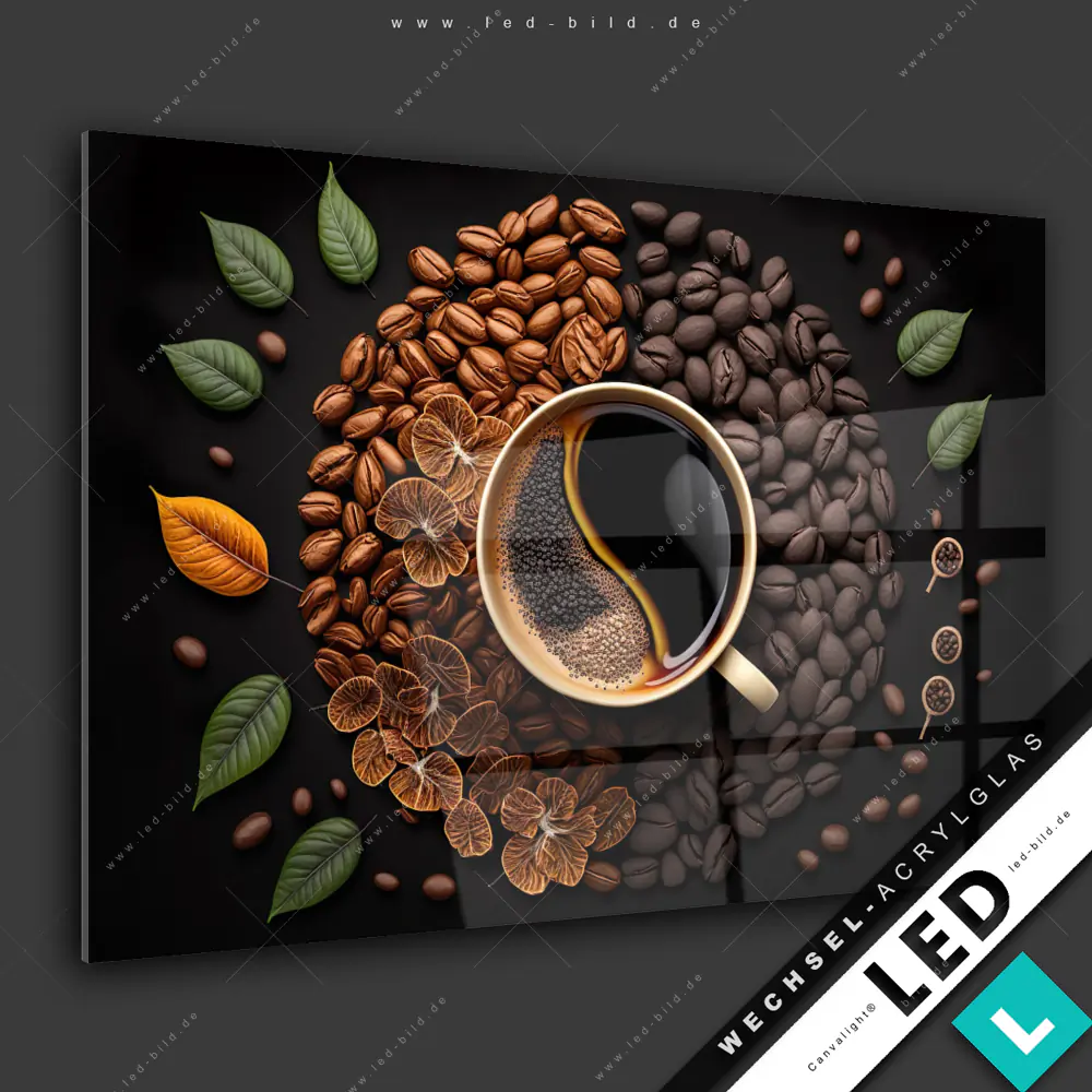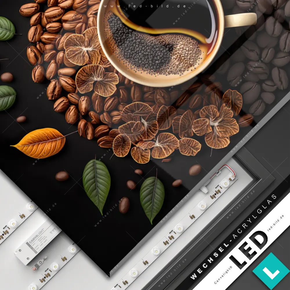 Canvalight® Wechsel-Acrylglas | Kaffee mit Blattdekoration | Querformat