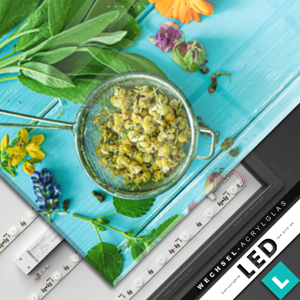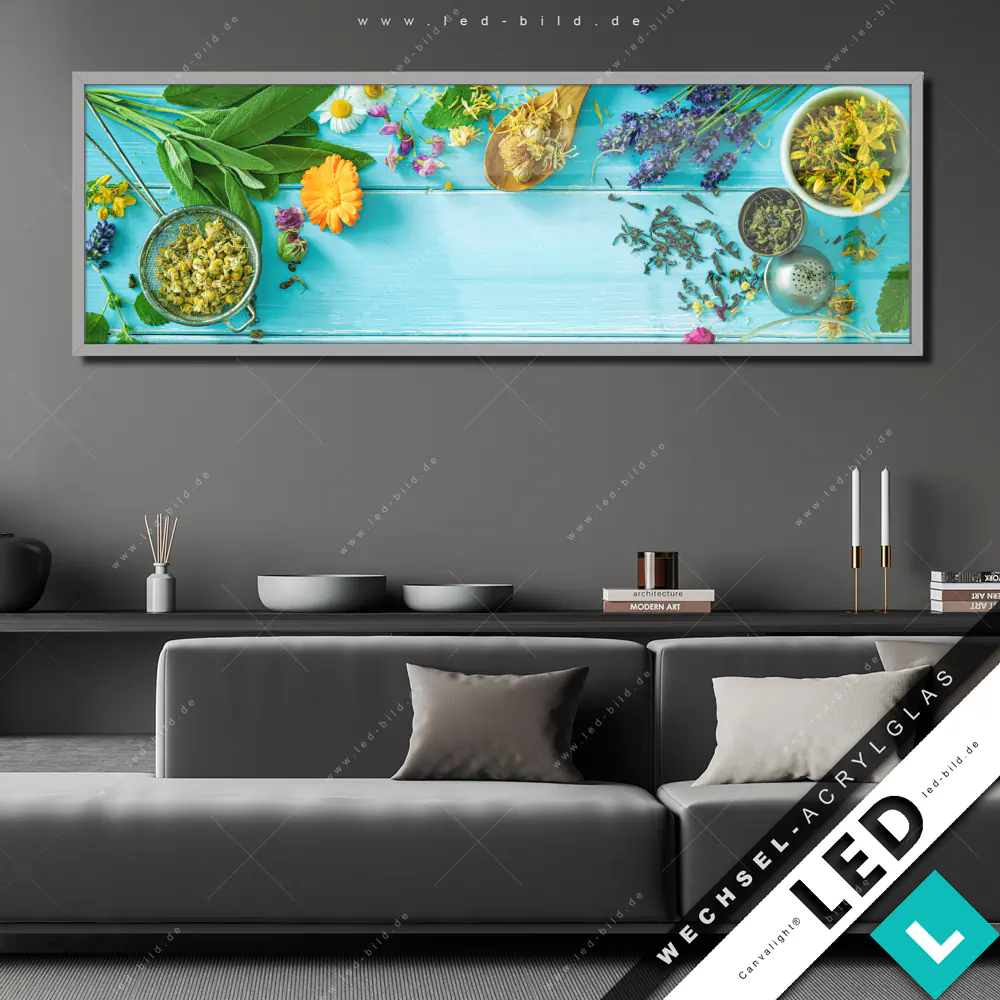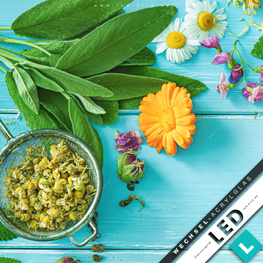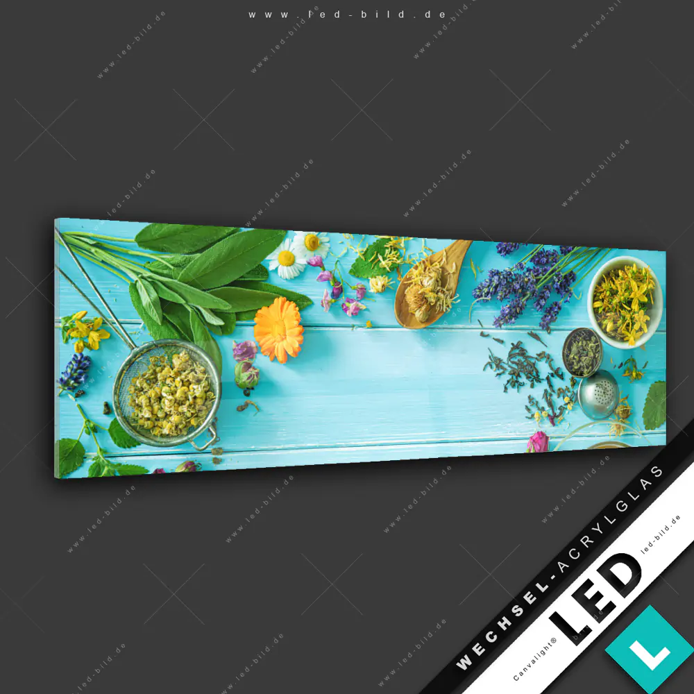 Canvalight® Wechsel-Acrylglas | Kräuter auf blauem Holztisch | Panorama