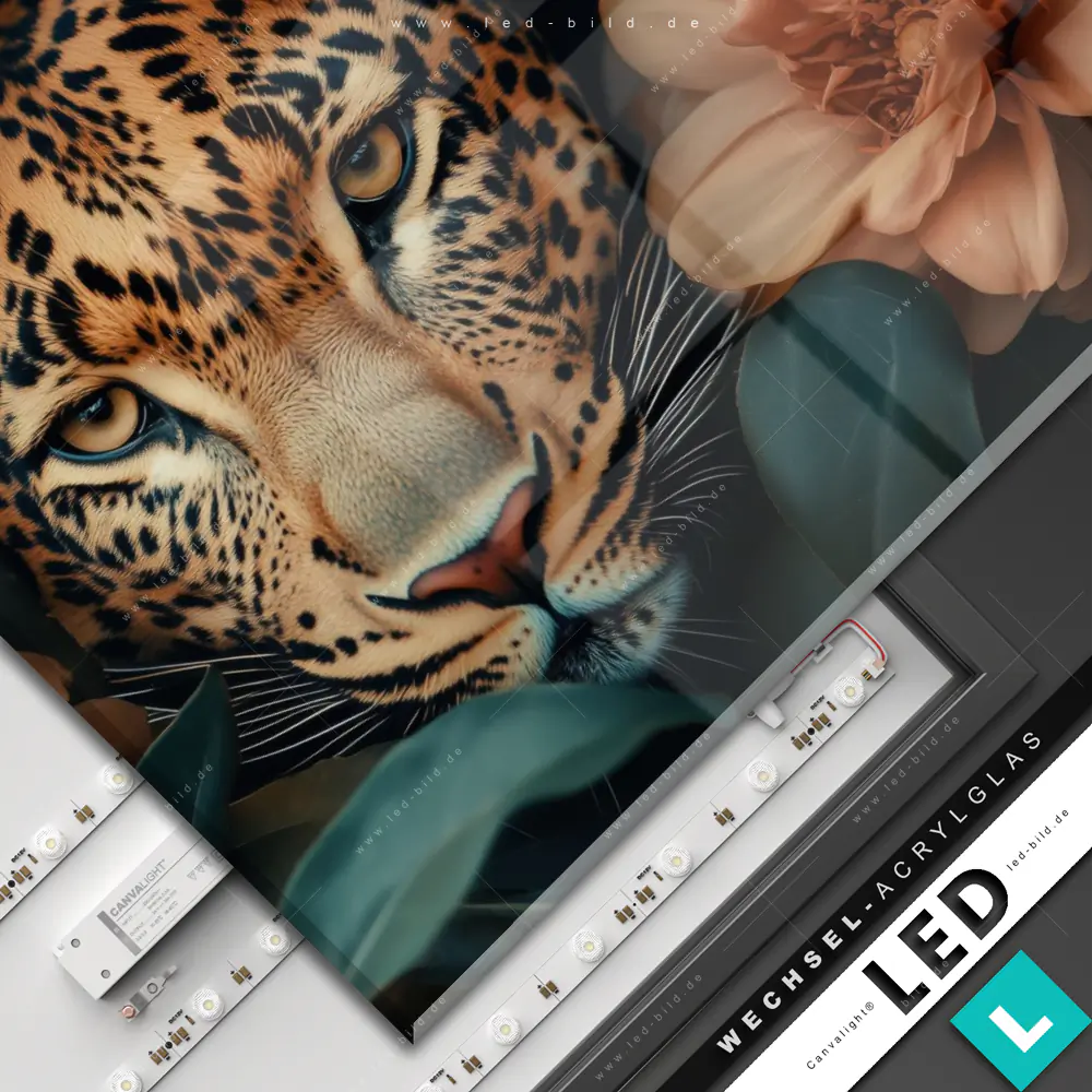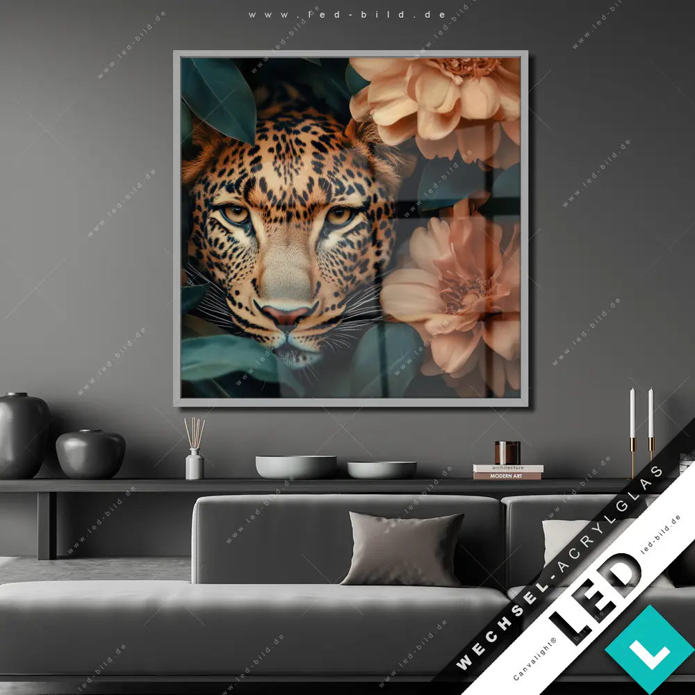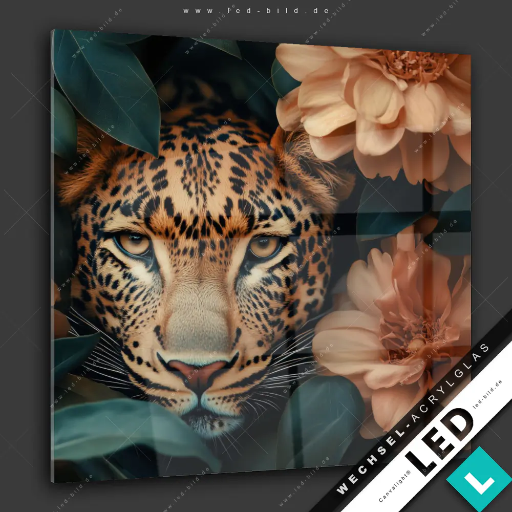 Canvalight® Wechsel-Acrylglas | Leopard im Blütenmeer | Quadrat
