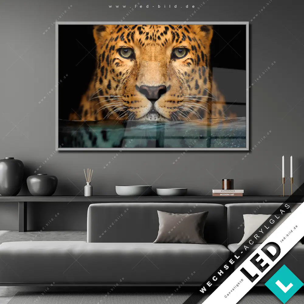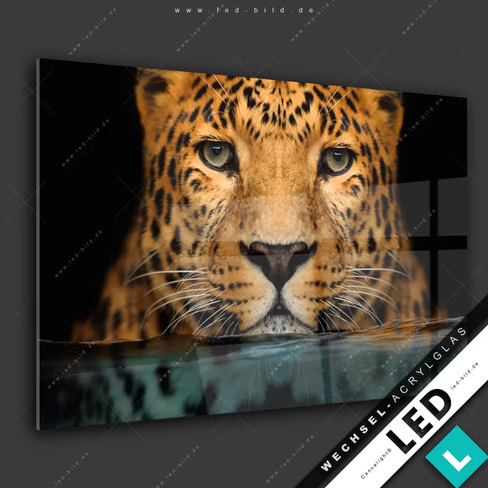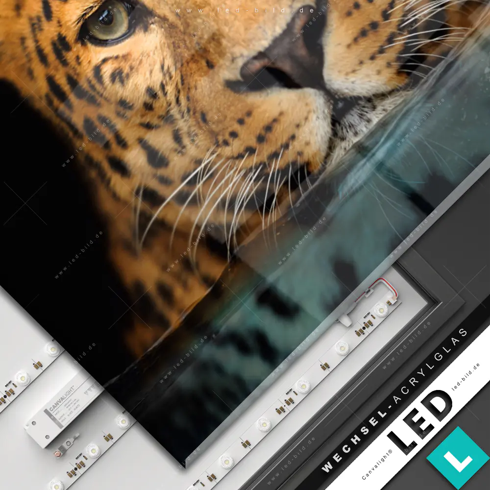 Canvalight® Wechsel-Acrylglas | Leopard im Wasser | Querformat